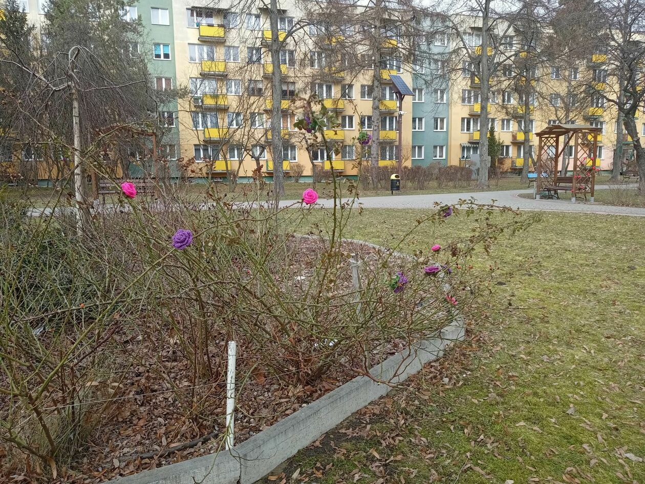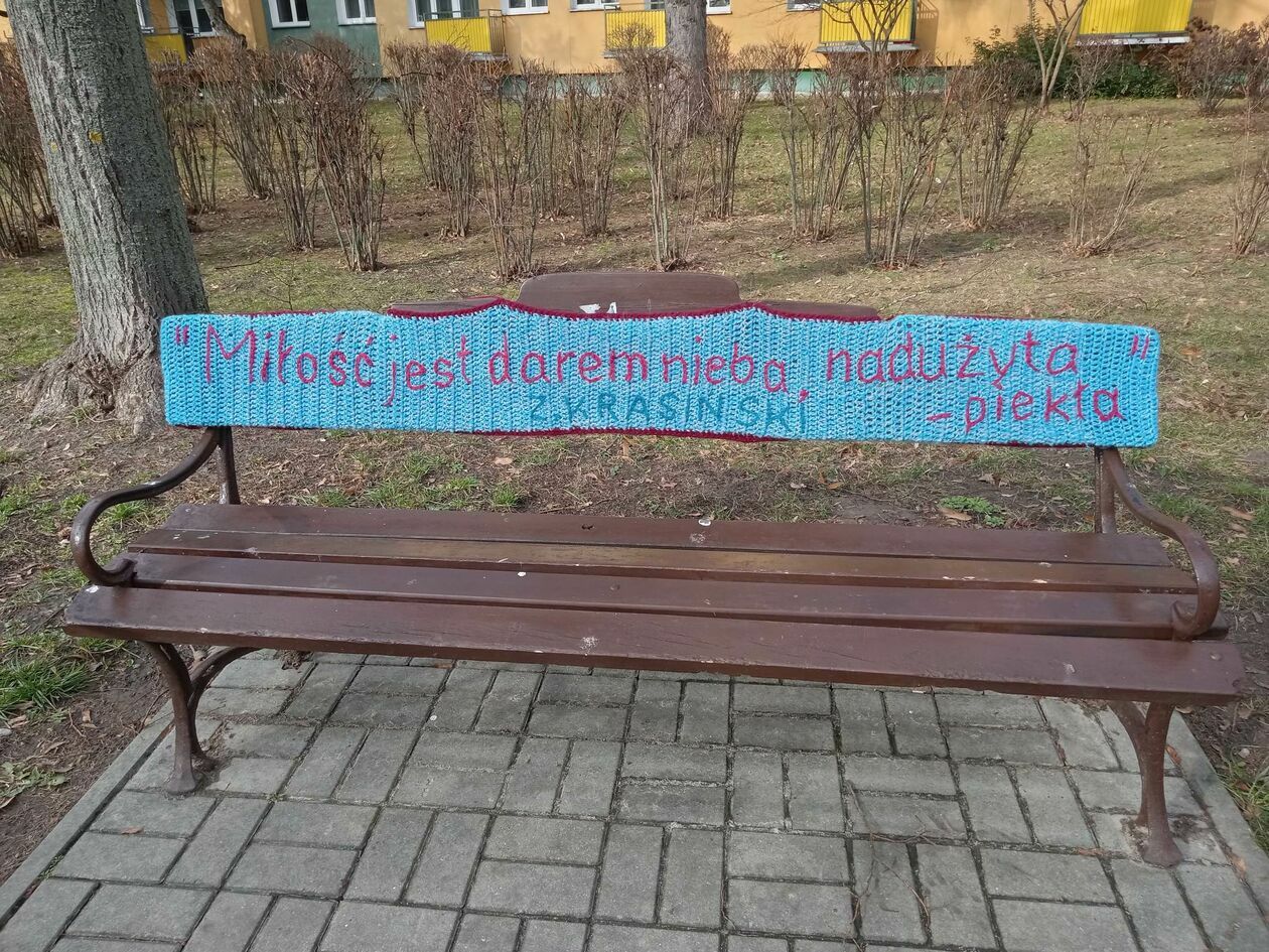Rzeźba pegaza na LSM ozdobiona włóczką