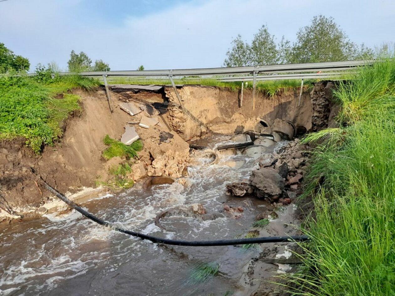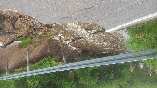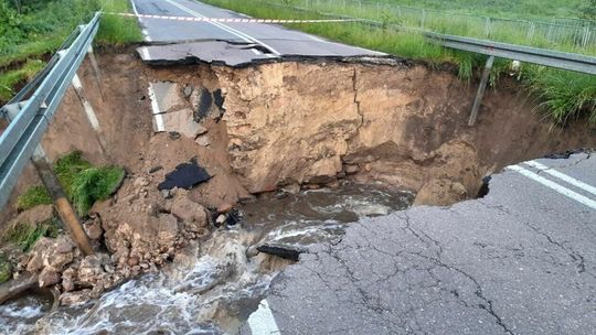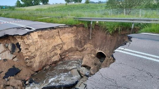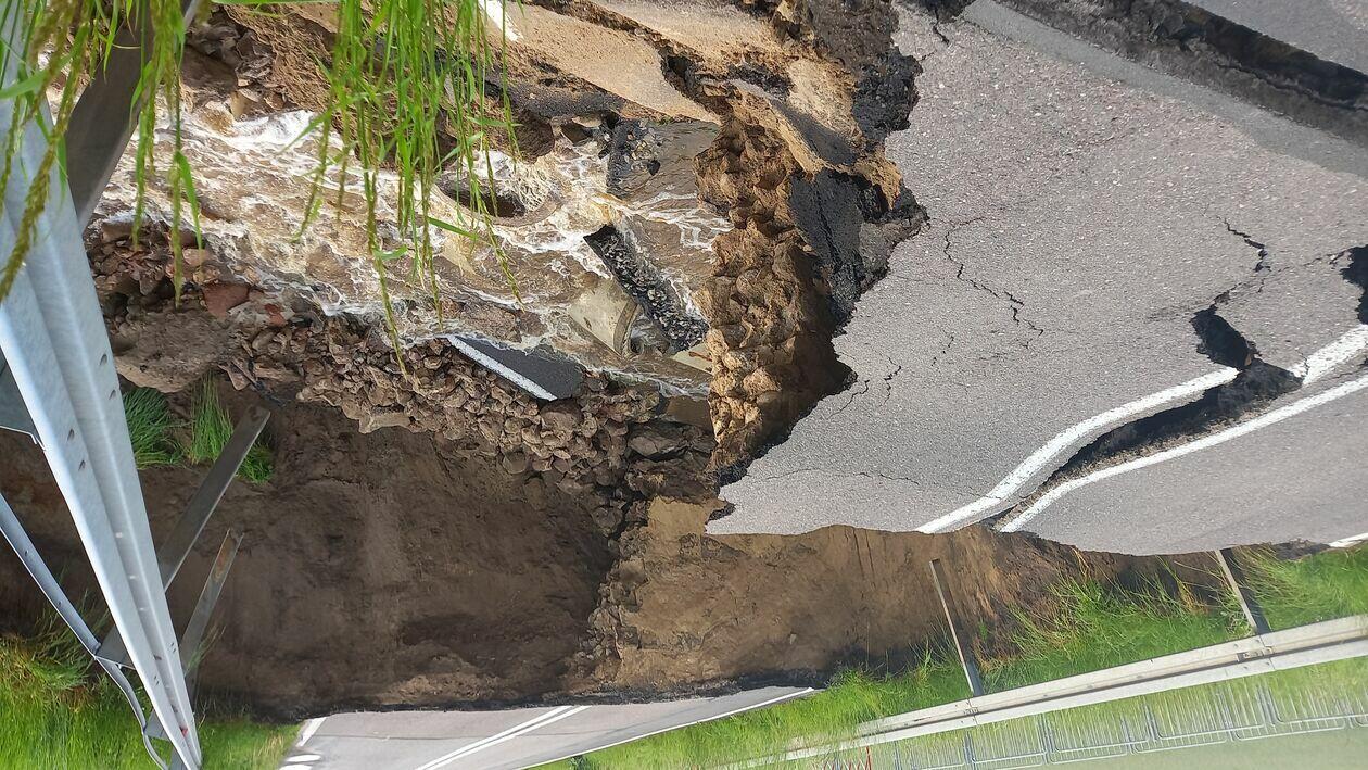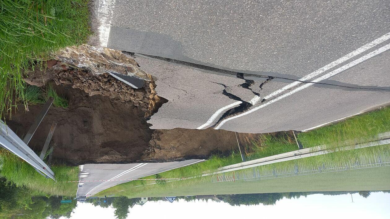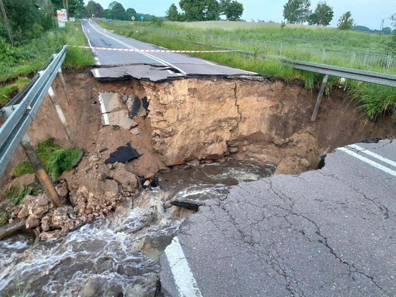 Kilkumetrowa wyrwa powstała w wyniku ulewy w drodze wojewódzkiej wzdłuż granicy z Białorusią. Do czasu naprawy ten fragment trasy nadbużańskiej będzie nieprzejezdny.