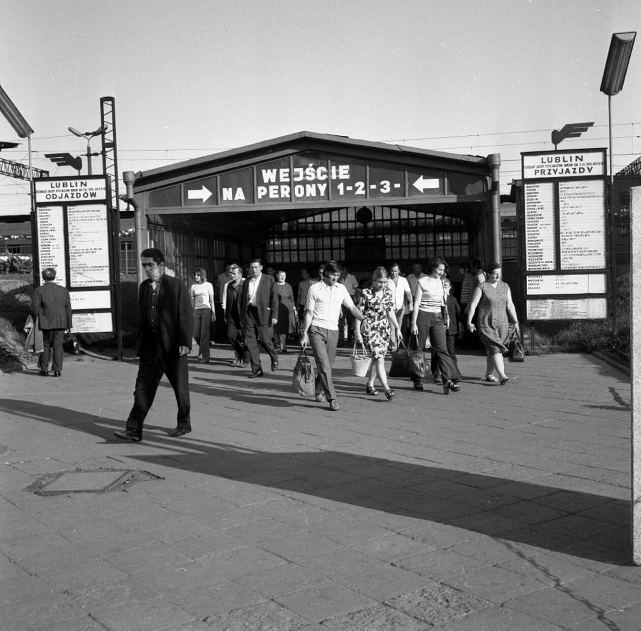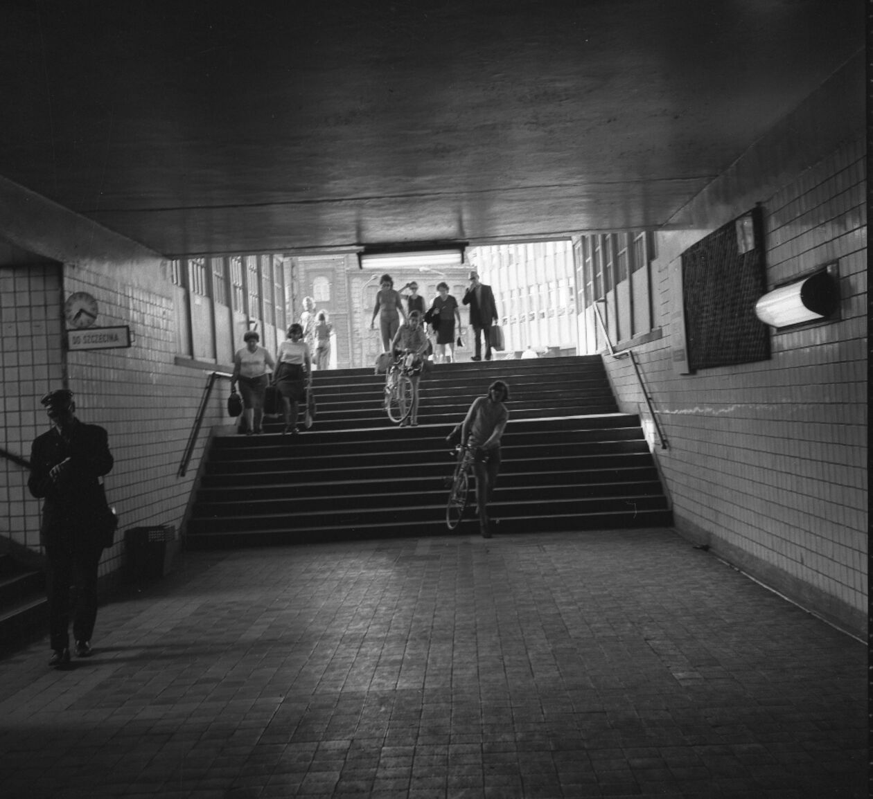 Wejście na perony. Pasażerowie idący w kierunku parkingu przy placu Dworcowym