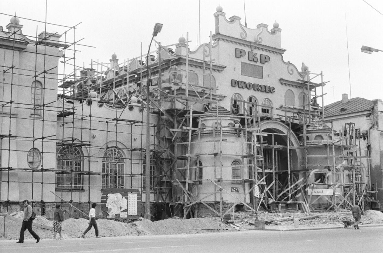Główny budynek dworca kolejowego PKP w Lublinie podczas remontu