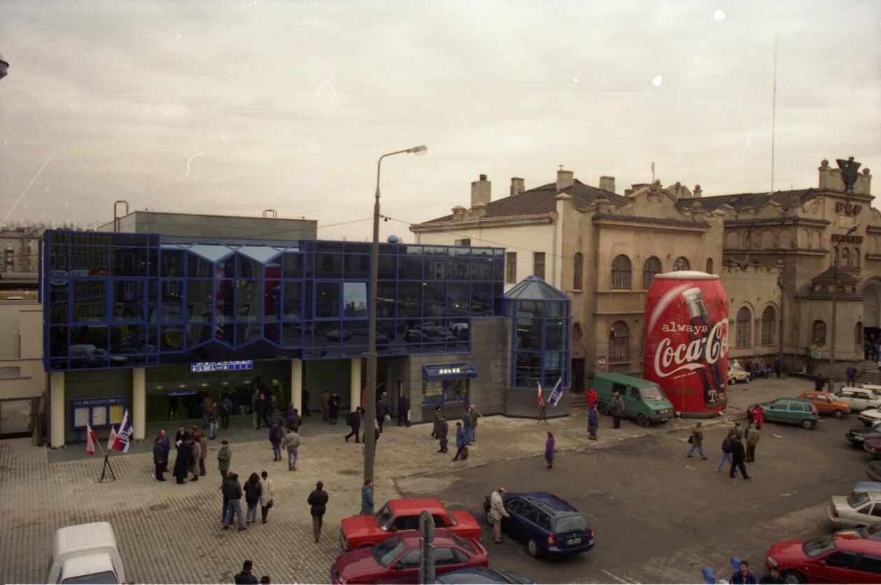 Kolejka na placu Dworcowym. W tle widoczne wejście główne dworca kolejowego PKP w Lublinie