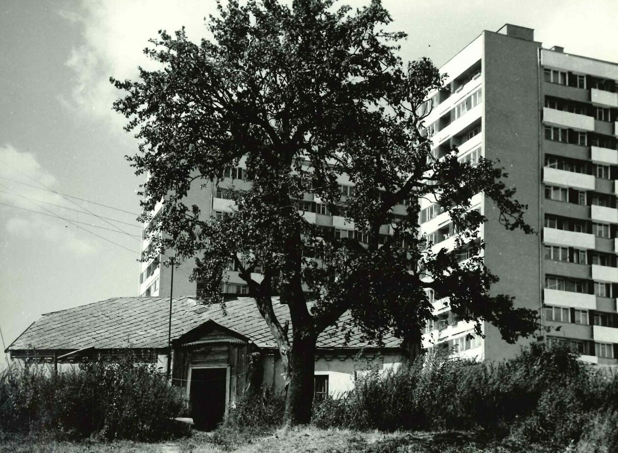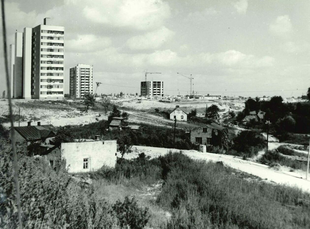 Sierakowszczyzna. Nieistniejąca zabudowa. Widoczna część bloku przy ul. Kiwerskiego oraz wieżowiec przy ul. Rutkowskiego 12 (obecnie Kleeberga)