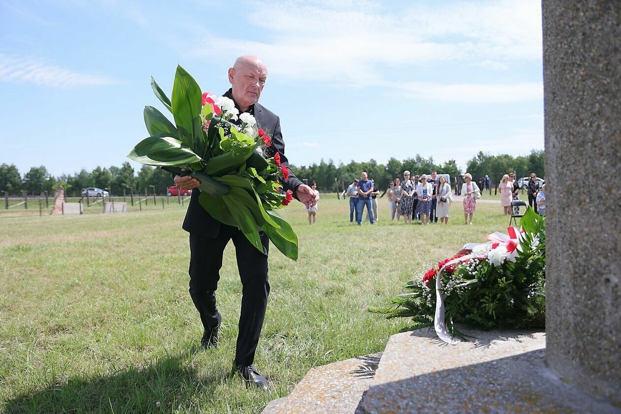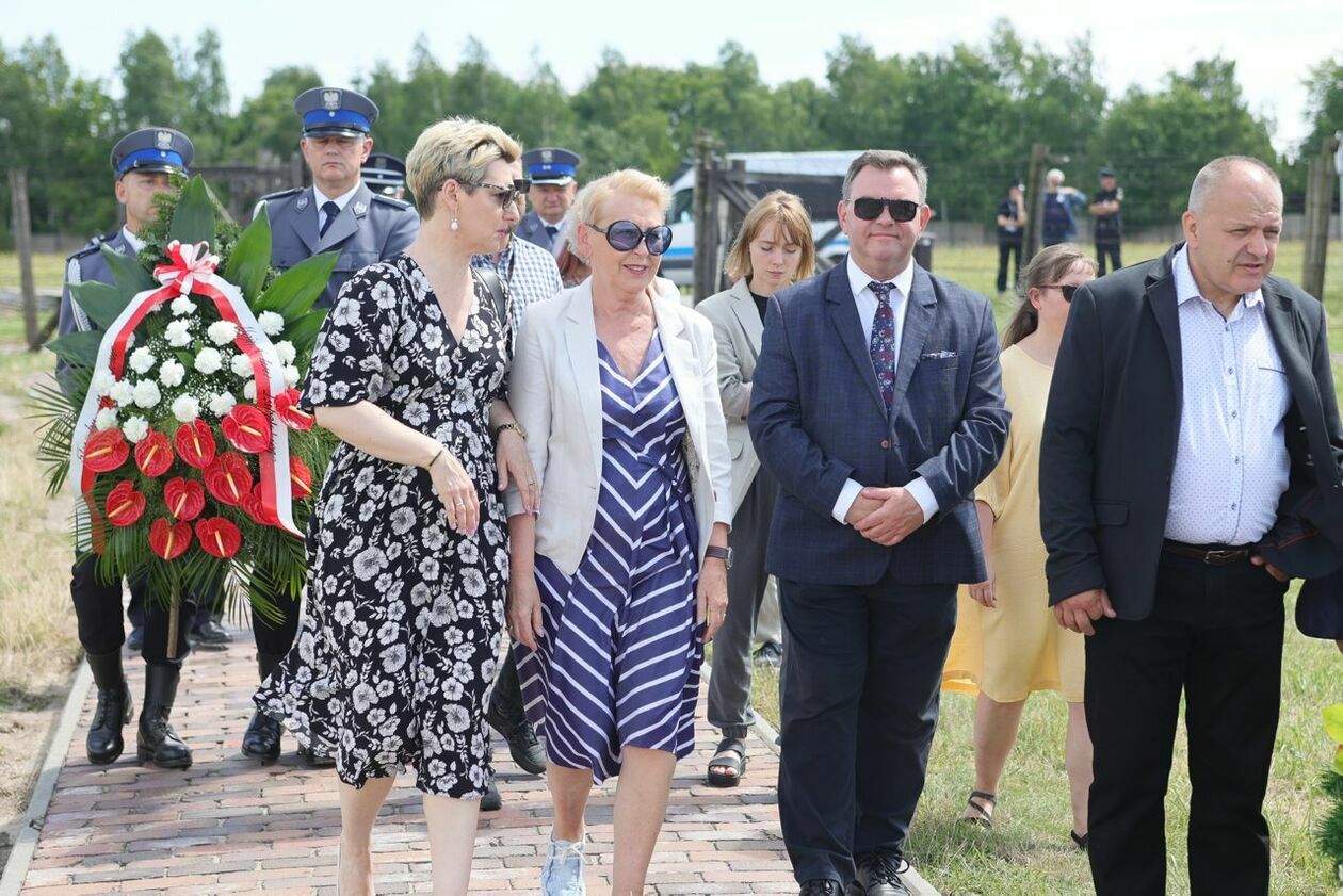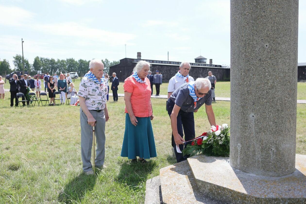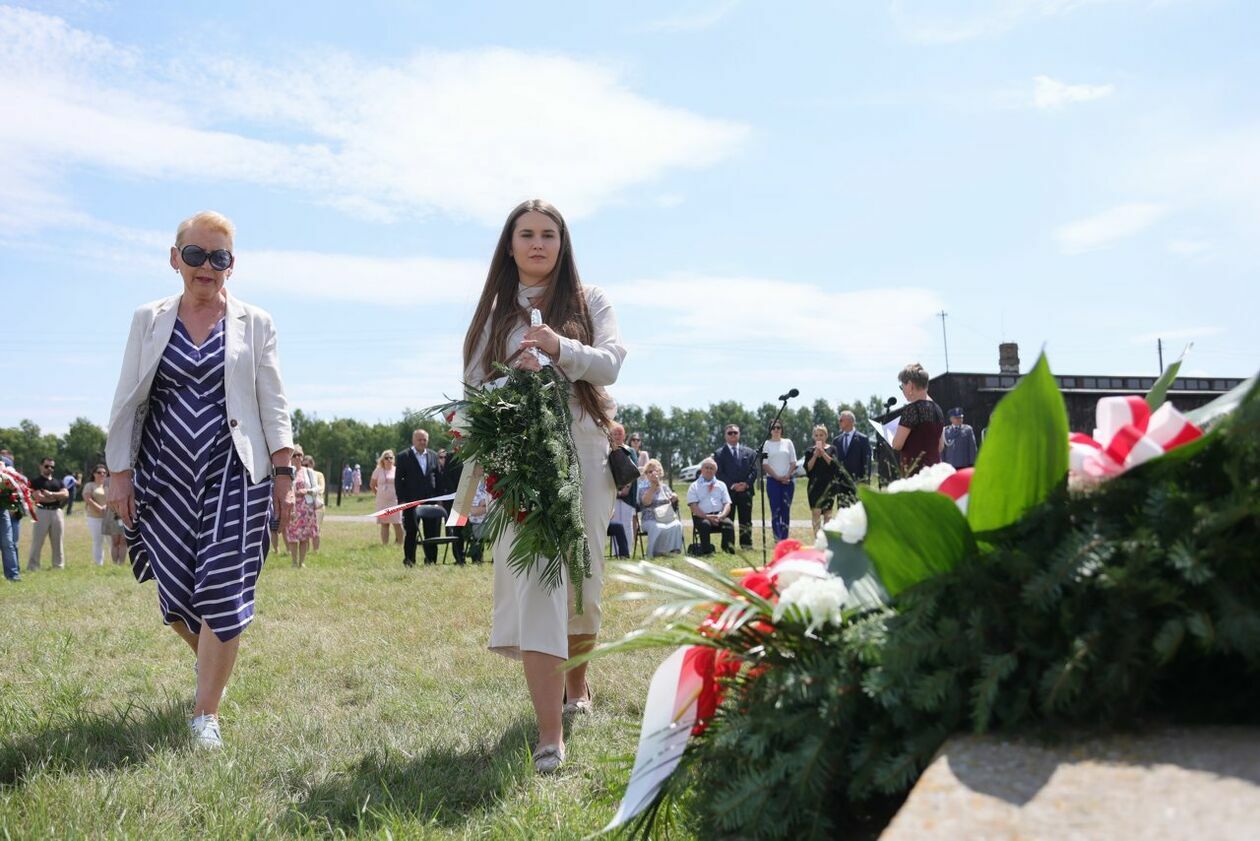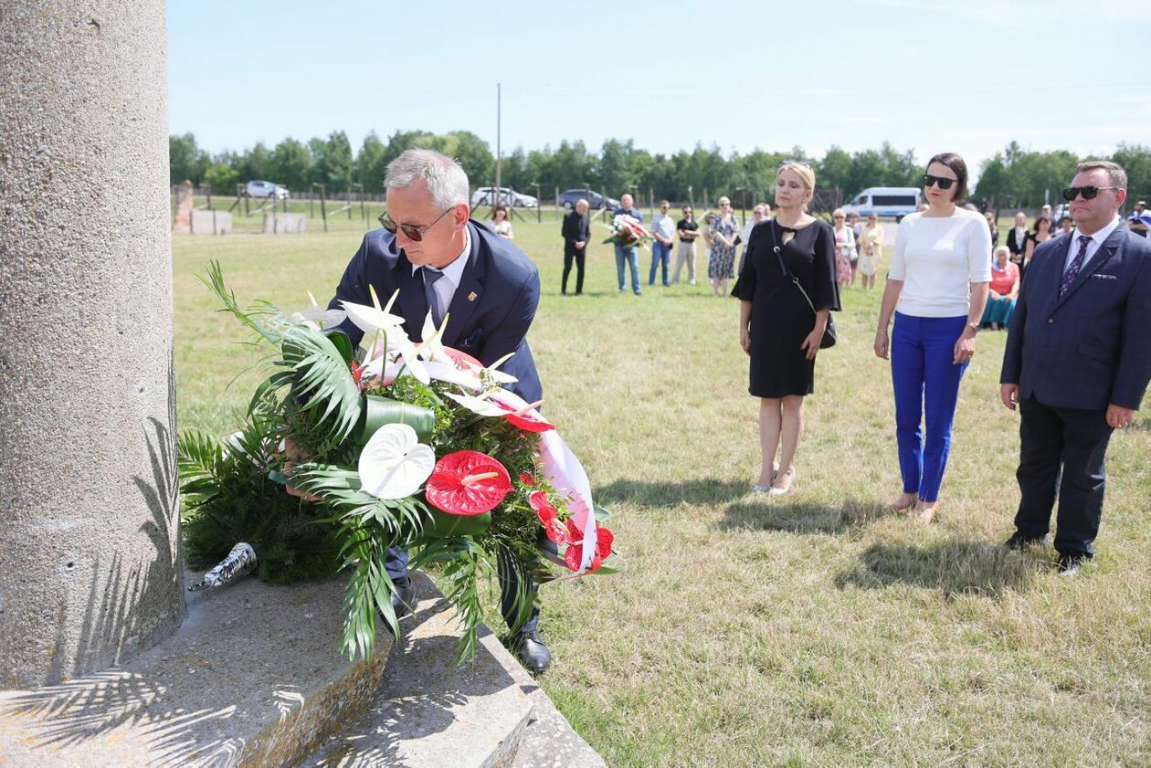 Byli więźniowie KL Lublin składają kwiaty przed pomnikiem Trzech Orłów na terenie byłego niemieckiego obozu koncetracyjnego.