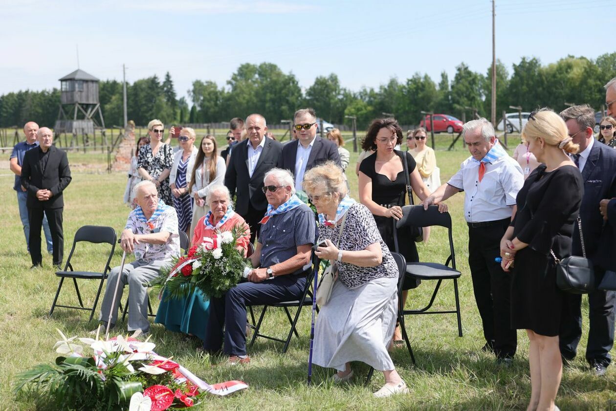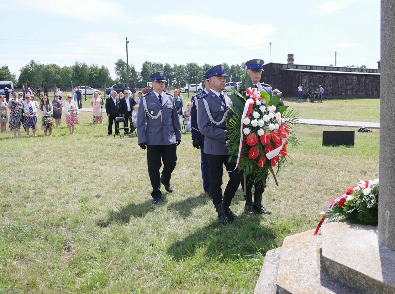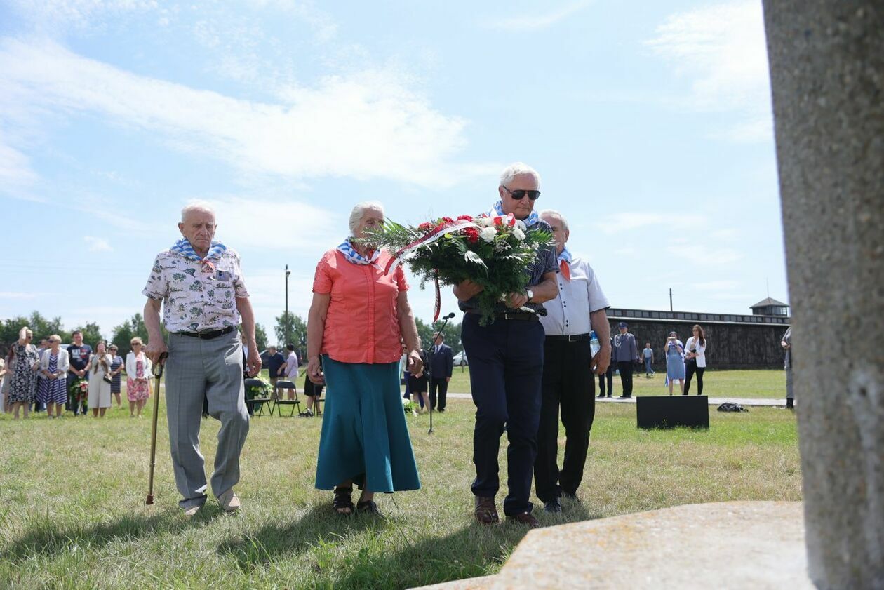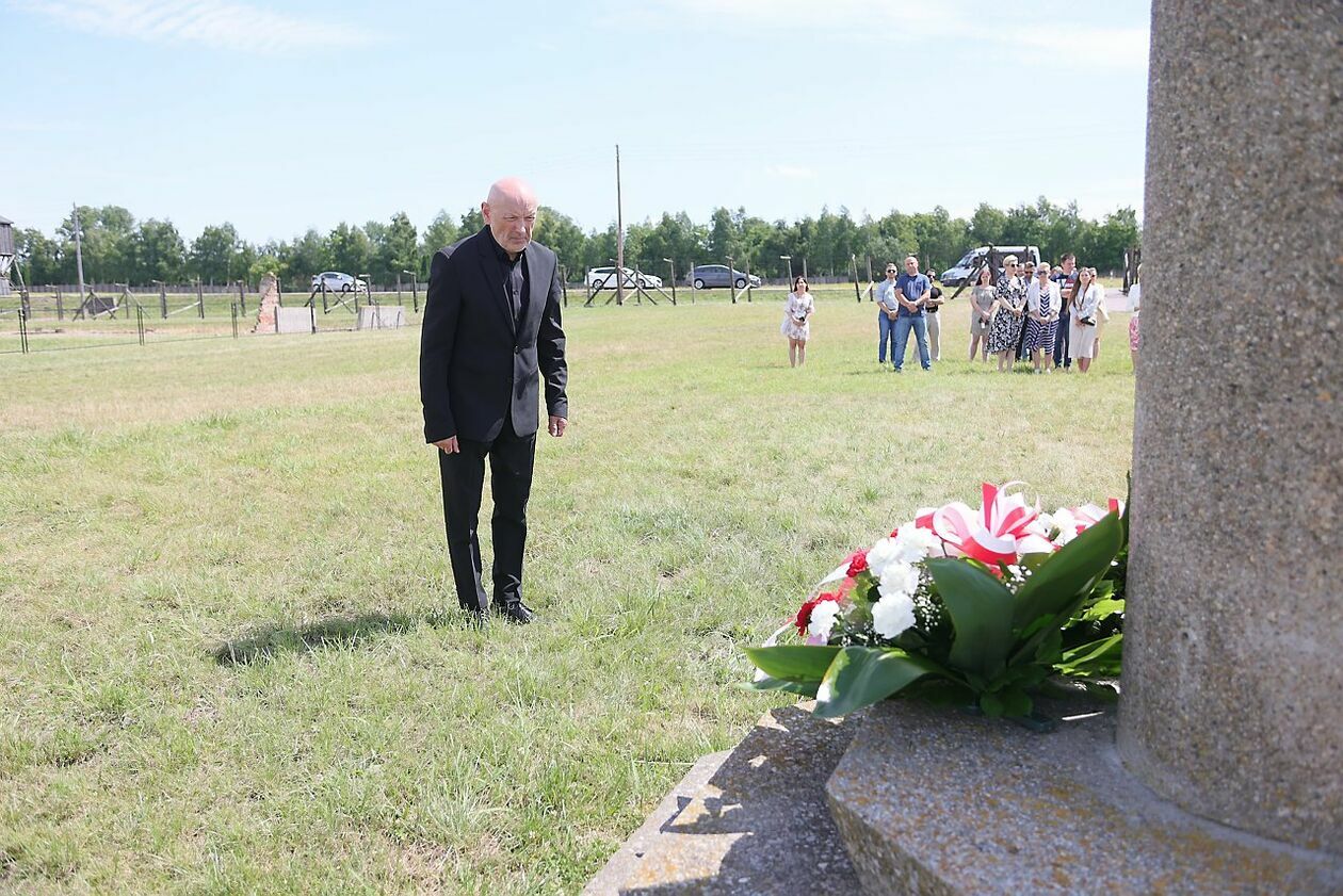 Byli więźniowie KL Lublin składają kwiaty przed pomnikiem Trzech Orłów na terenie byłego niemieckiego obozu koncetracyjnego.