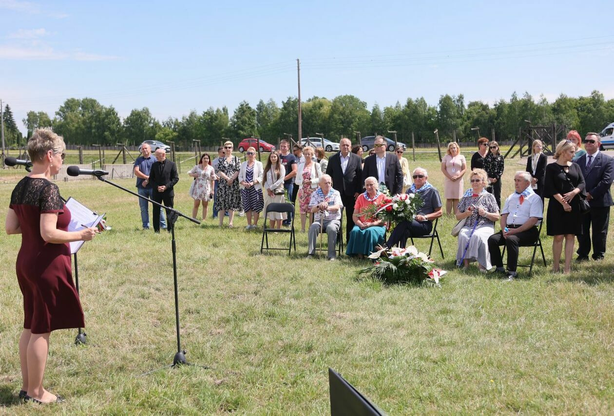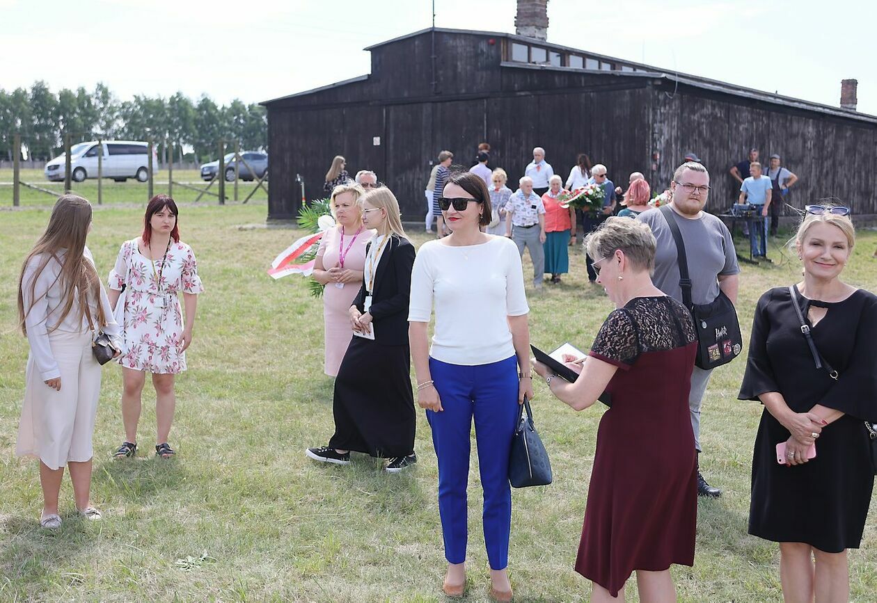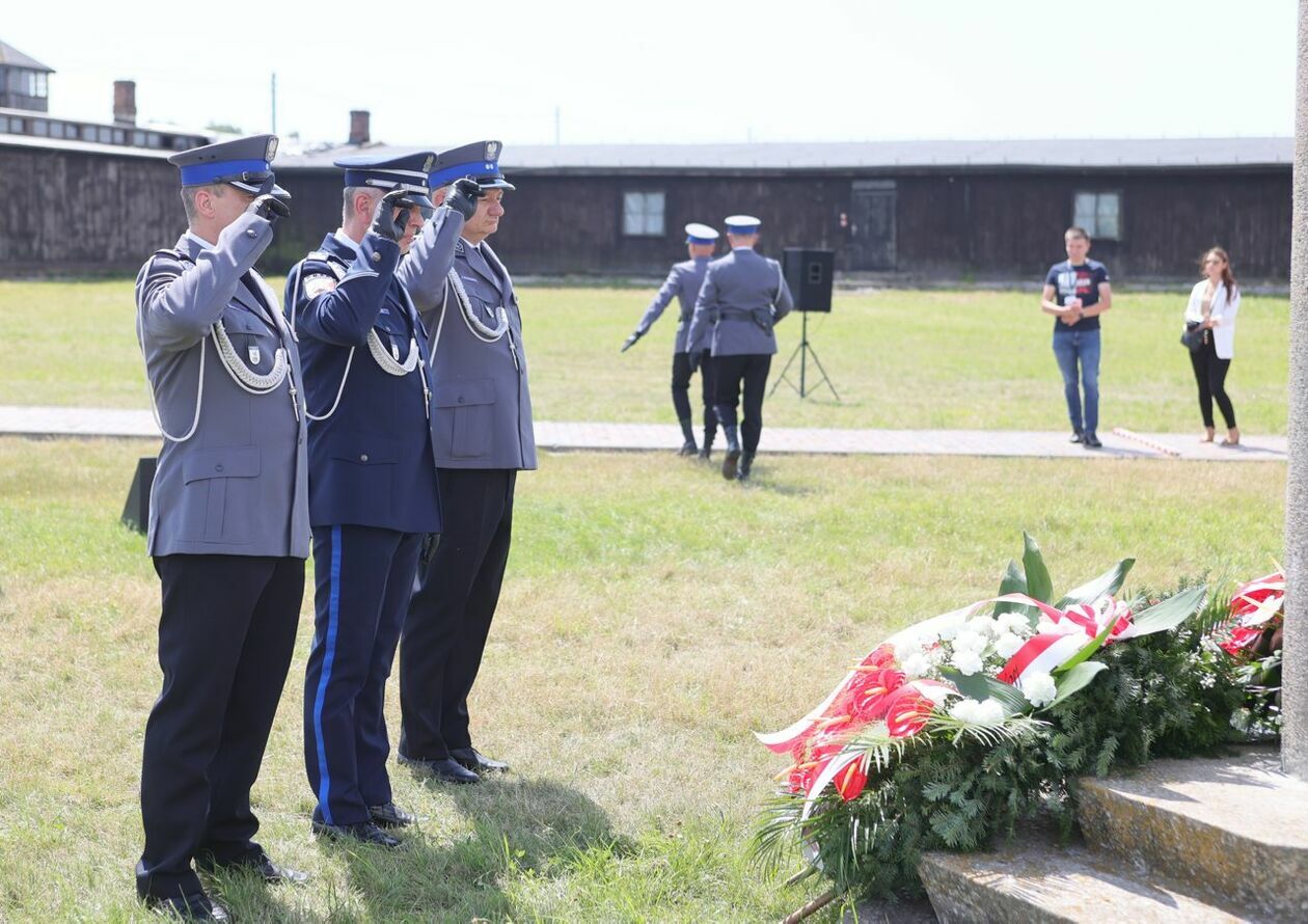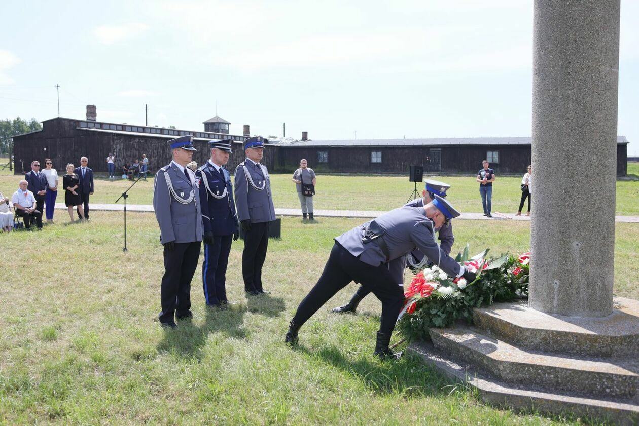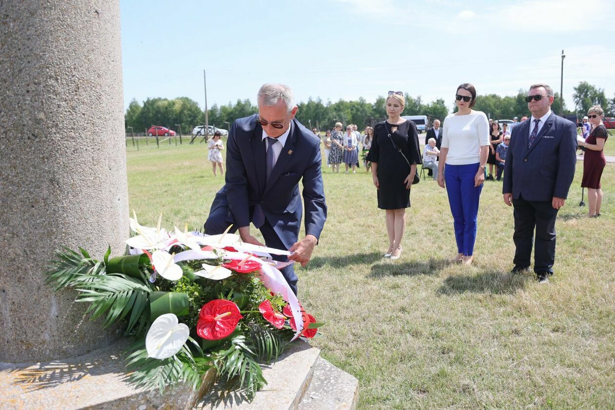 Byli więźniowie KL Lublin składają kwiaty przed pomnikiem Trzech Orłów na terenie byłego niemieckiego obozu koncetracyjnego.