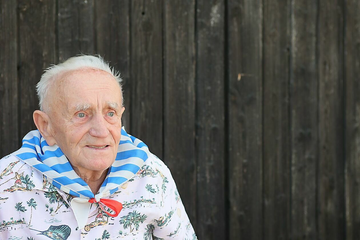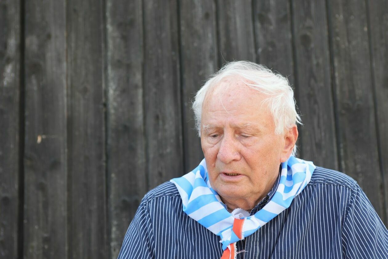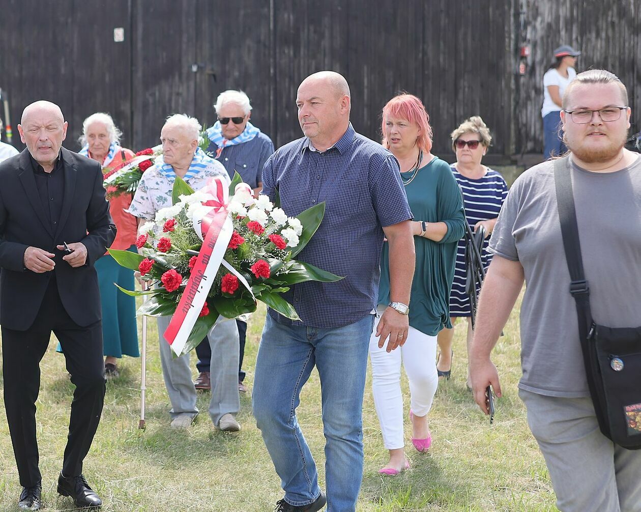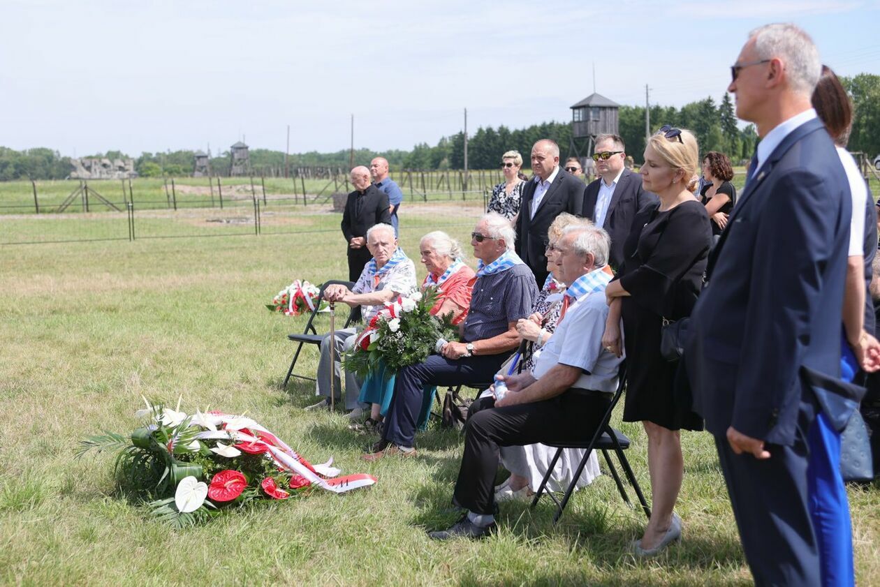 Byli więźniowie KL Lublin składają kwiaty przed pomnikiem Trzech Orłów na terenie byłego niemieckiego obozu koncetracyjnego.