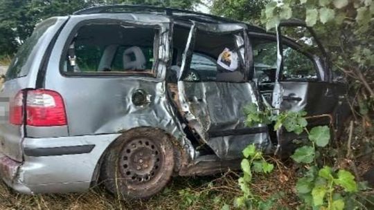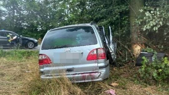 Kierowca forda zjechał z drogi i uderzył prawym bokiem pojazdu w drzewo