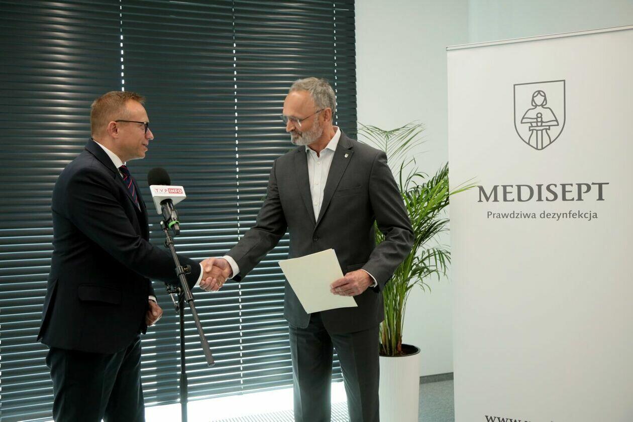 Konferencja prasowa ministra Artura Sobonia poświęcona przekazaniu decyzji o wsparciu dla Medisept