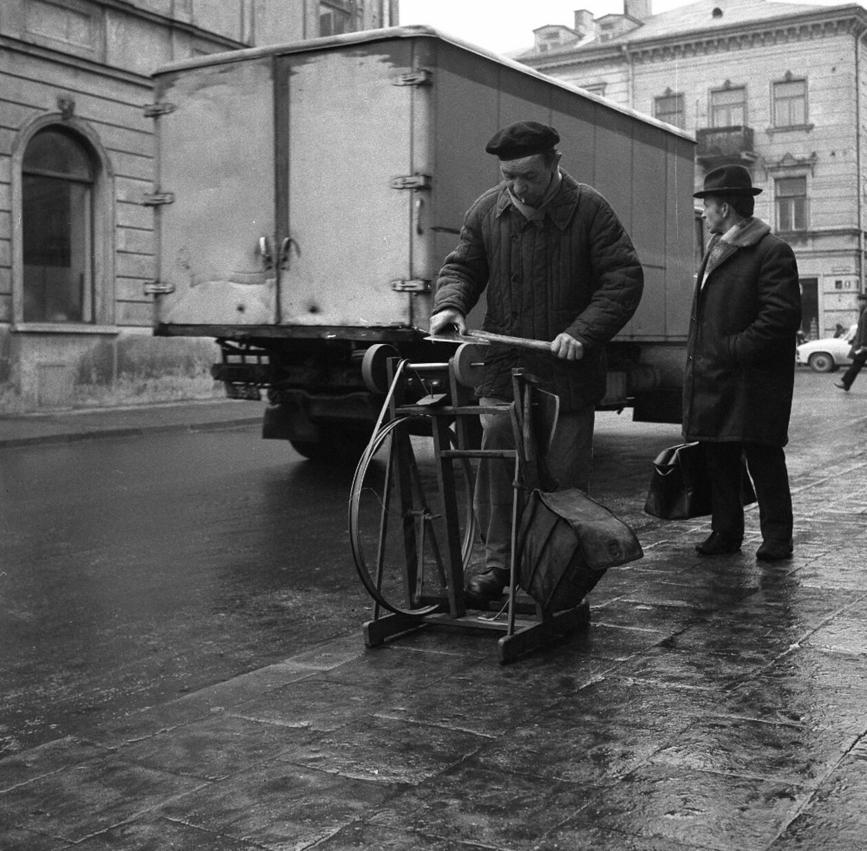 Mężczyzna ostrzący noże przy ul. Świętoduskiej