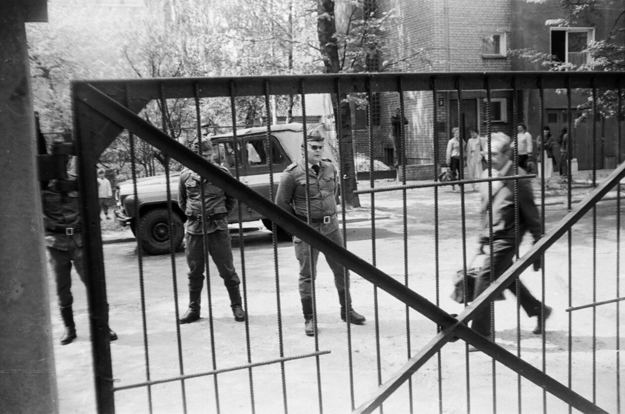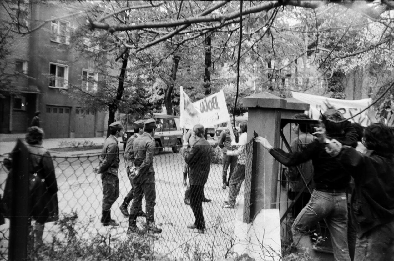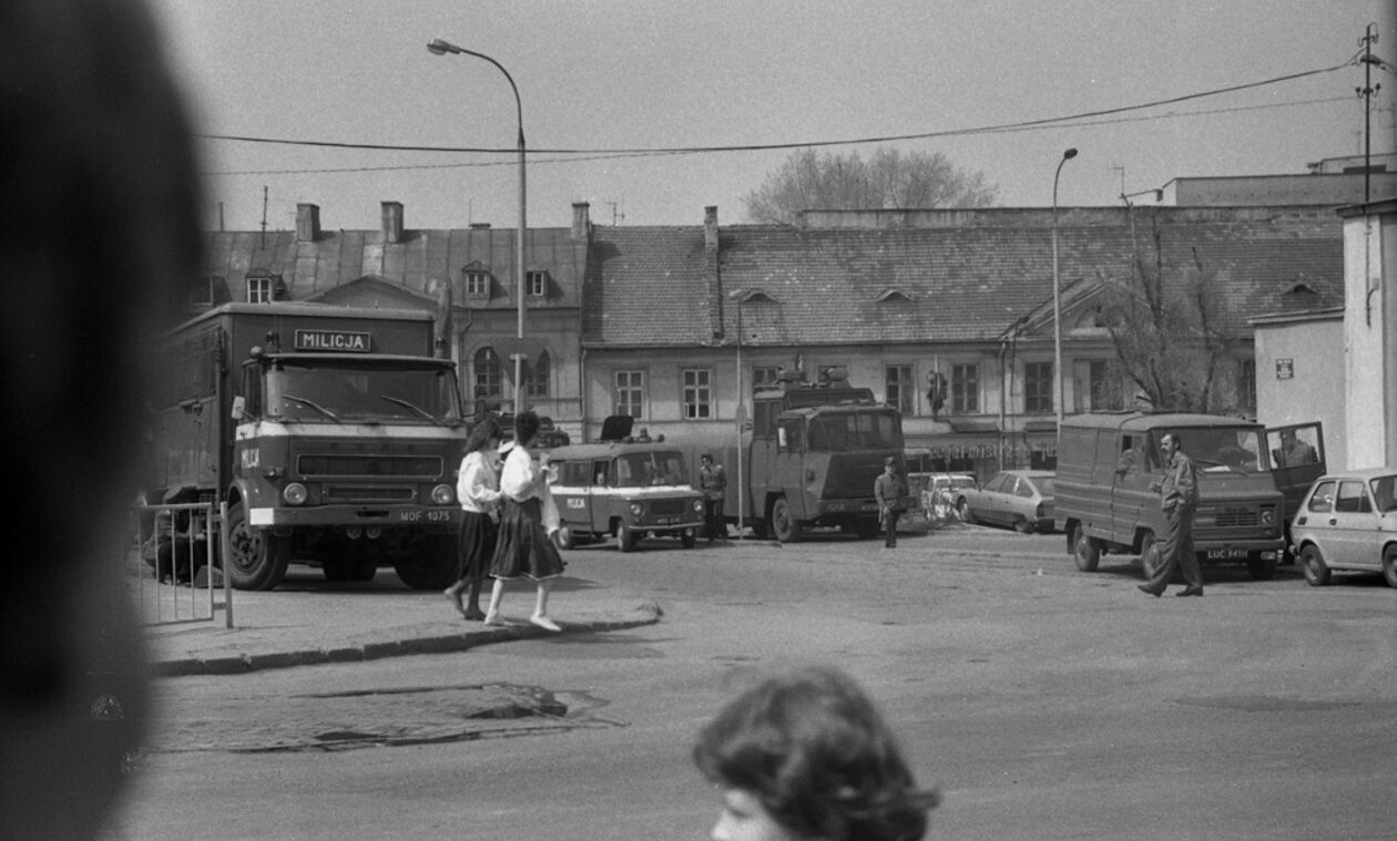 Oddział MP blokujący przejscie manifestacji studenckiej odbywającej się 10 maja 1988 r. w Lublinie
