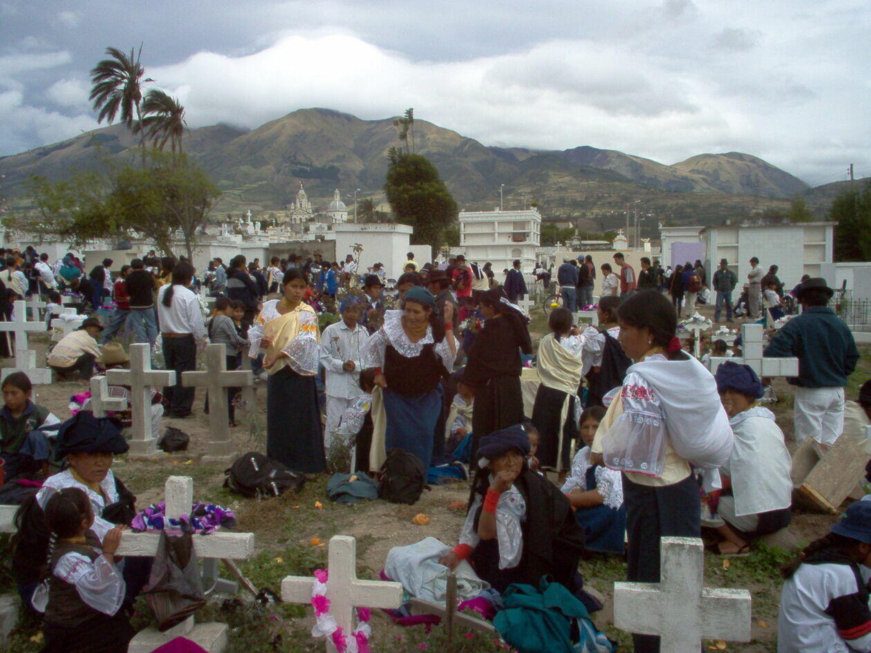 Ekwadorczycy to w większości katolicy, jednak znajdziemy tam takze naleciałości z kultury Inków. Podczas święta zmarłych Ekwadorczycy zanoszą na groby zmarłych napój z fioletowej kukurydzy czy chlebki w kształcie niemowlaków. Żywi mogą pożywić się dopiero gdy martwi się najedzą.