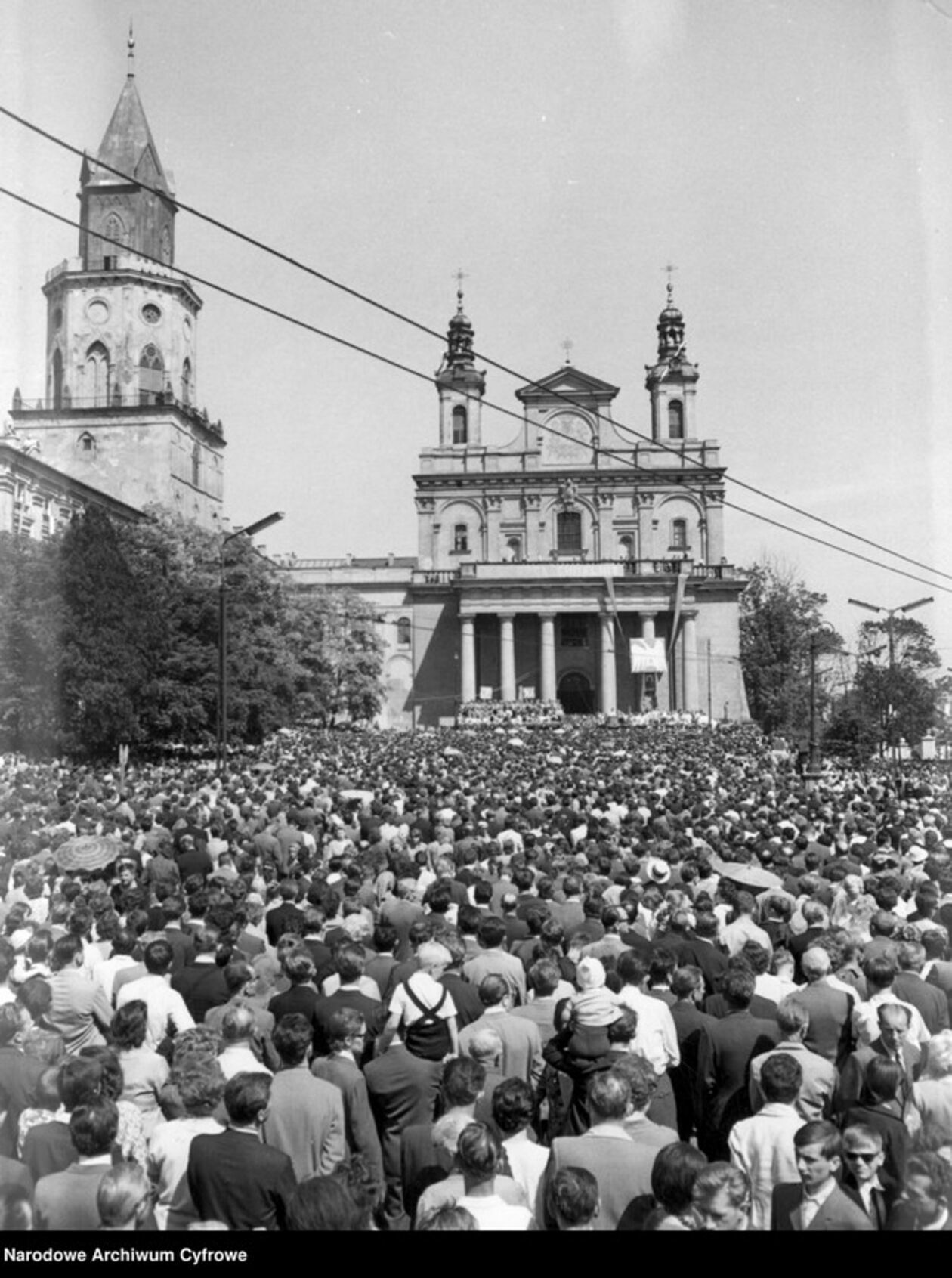 Plac przed katedrą Świętego Jana Chrzciciela i Świętego Jana Ewangelisty wypełniony uczestnikami uroczystości (1966 r.).