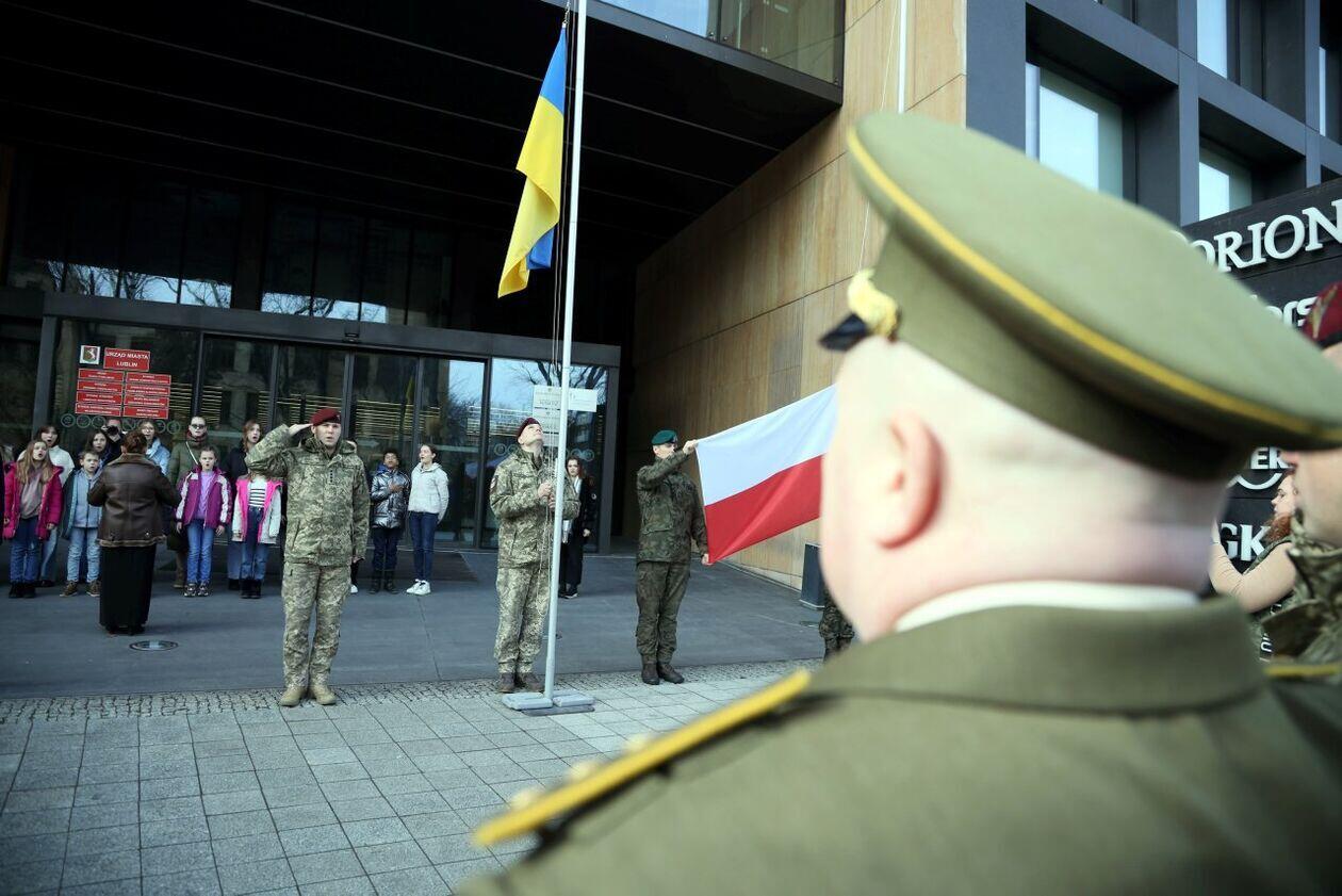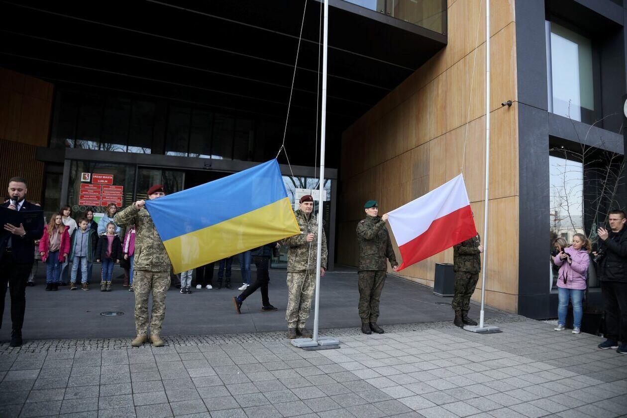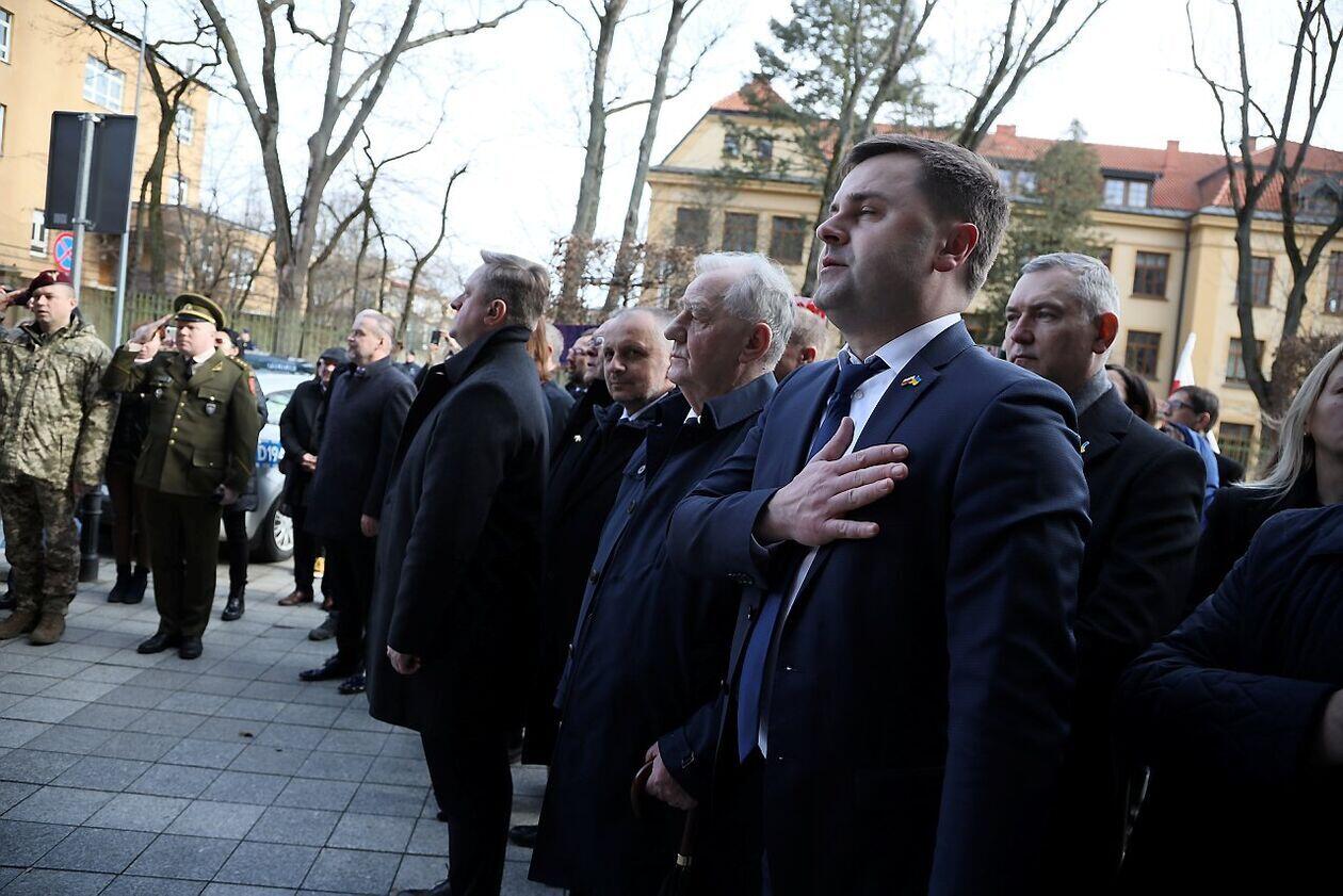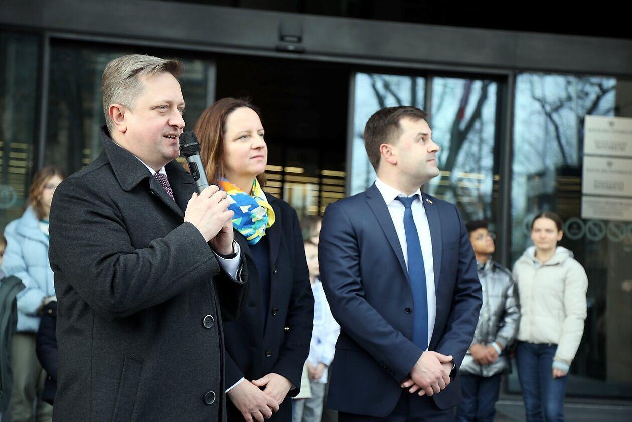 Podniesienie flag Polski i Ukrainy przed Konsulatem Ukrainy w Lublinie