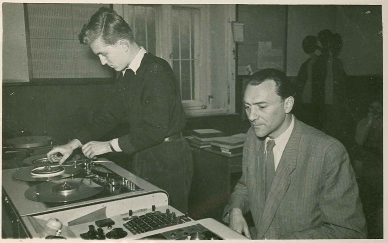 Fotografia przedstawia redaktorów Polskiego Radia Lublin podczas pracy w studiu radiowym. Pierwszy z lewej Marek Chołdzyński – realizator dźwięku