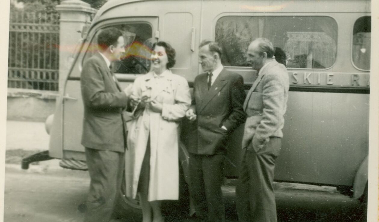Pracownicy Polskiego Radia przy wozie transmisyjnym, pod willą Polskiego Radia przy ul. Spokojnej