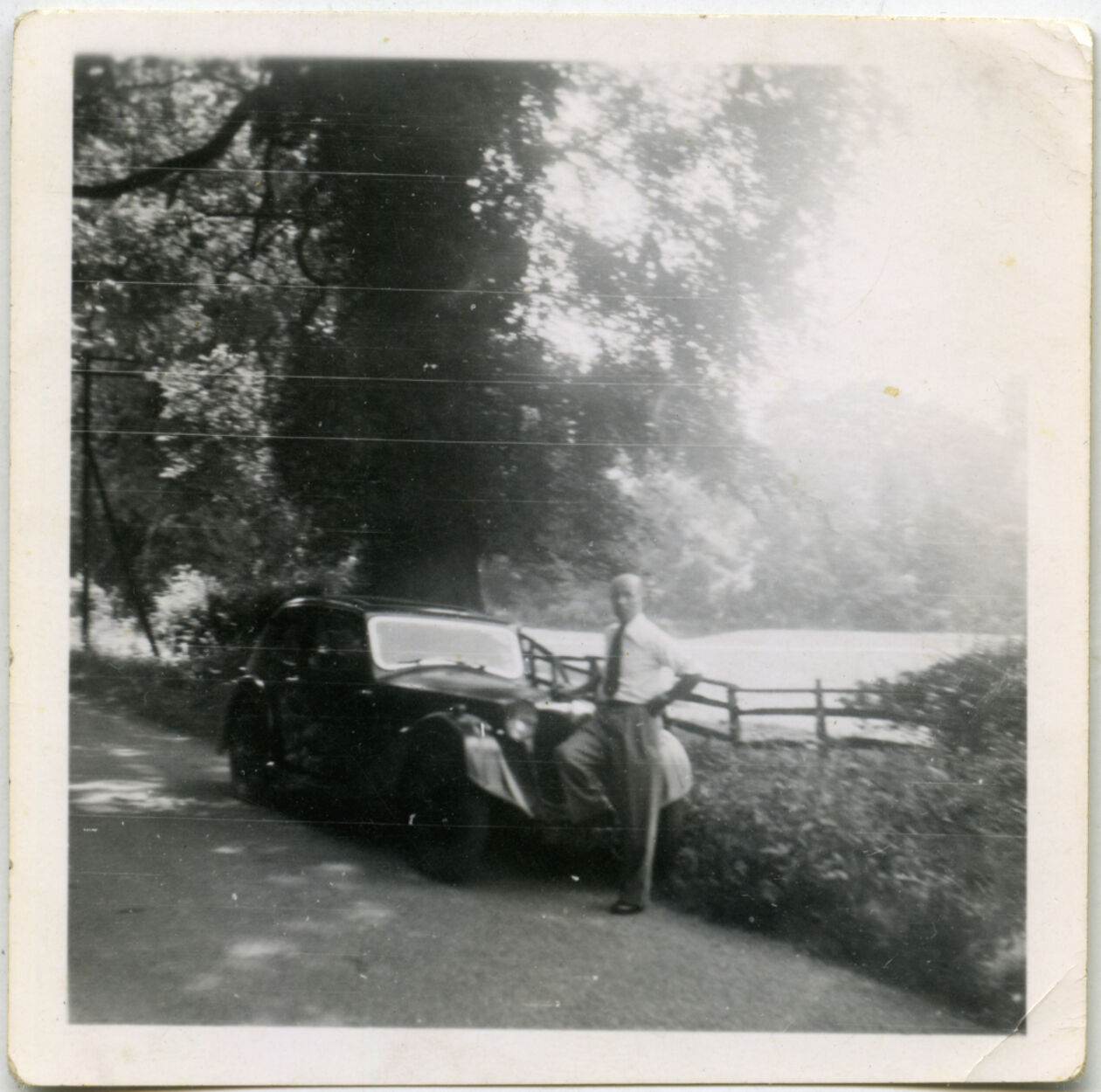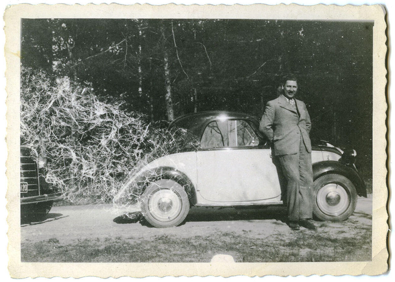 Mężczyzna obok samochodu. Lata 30-te. Teatr NN.