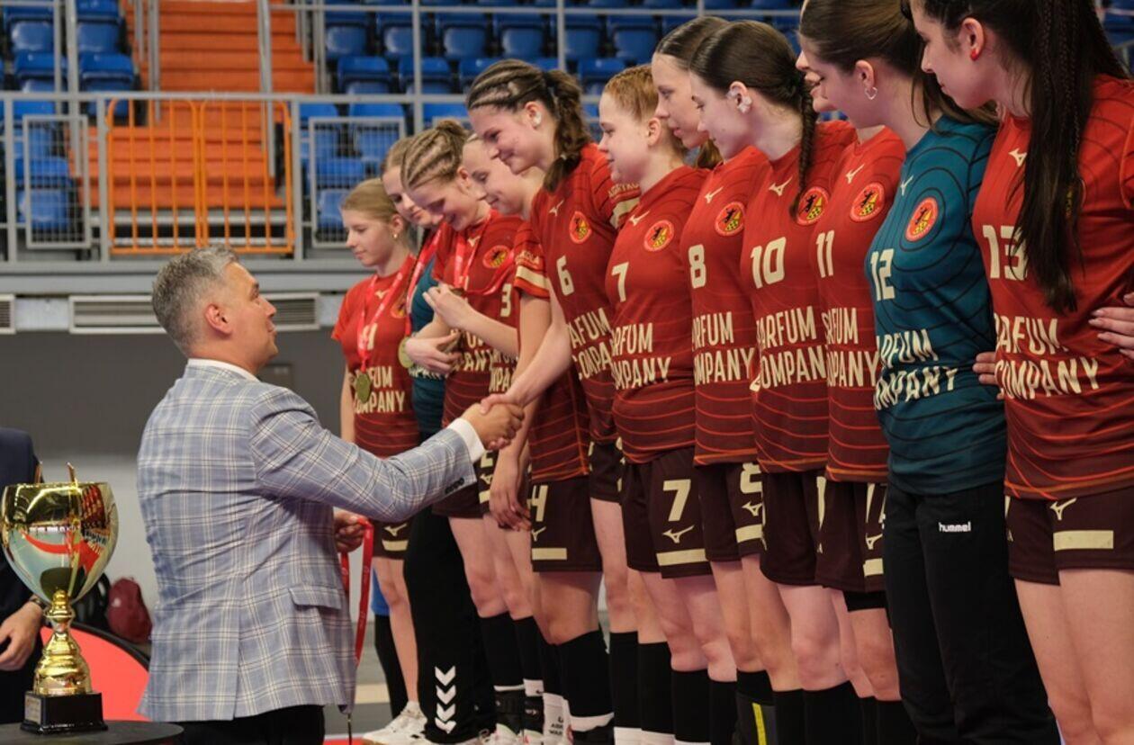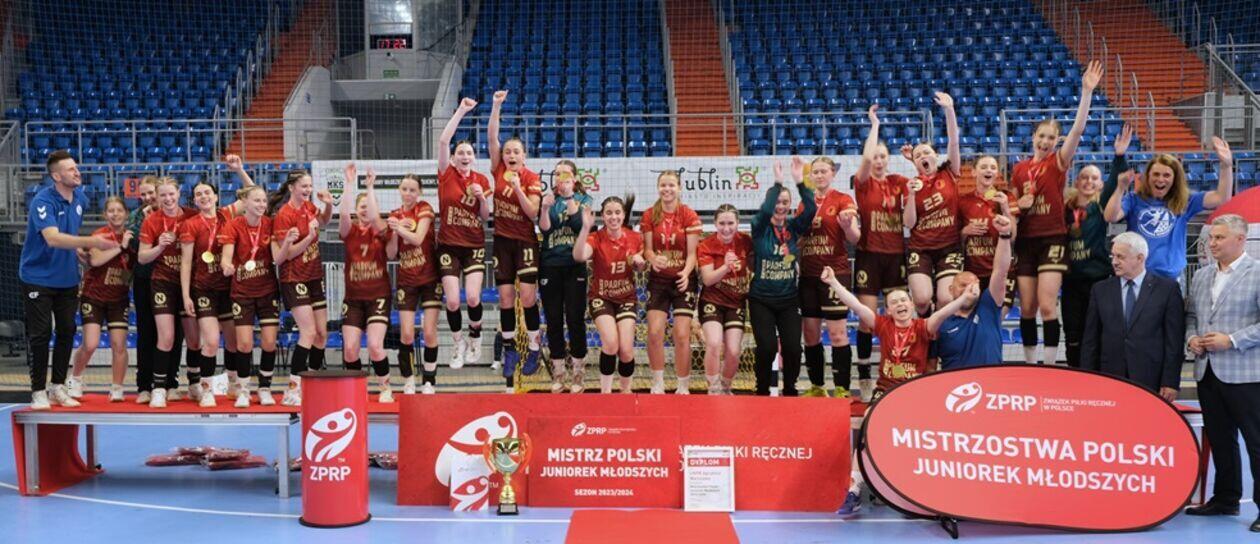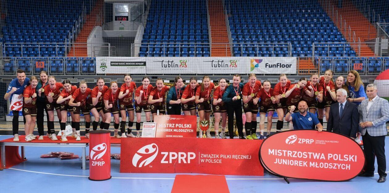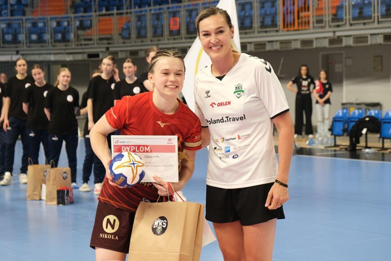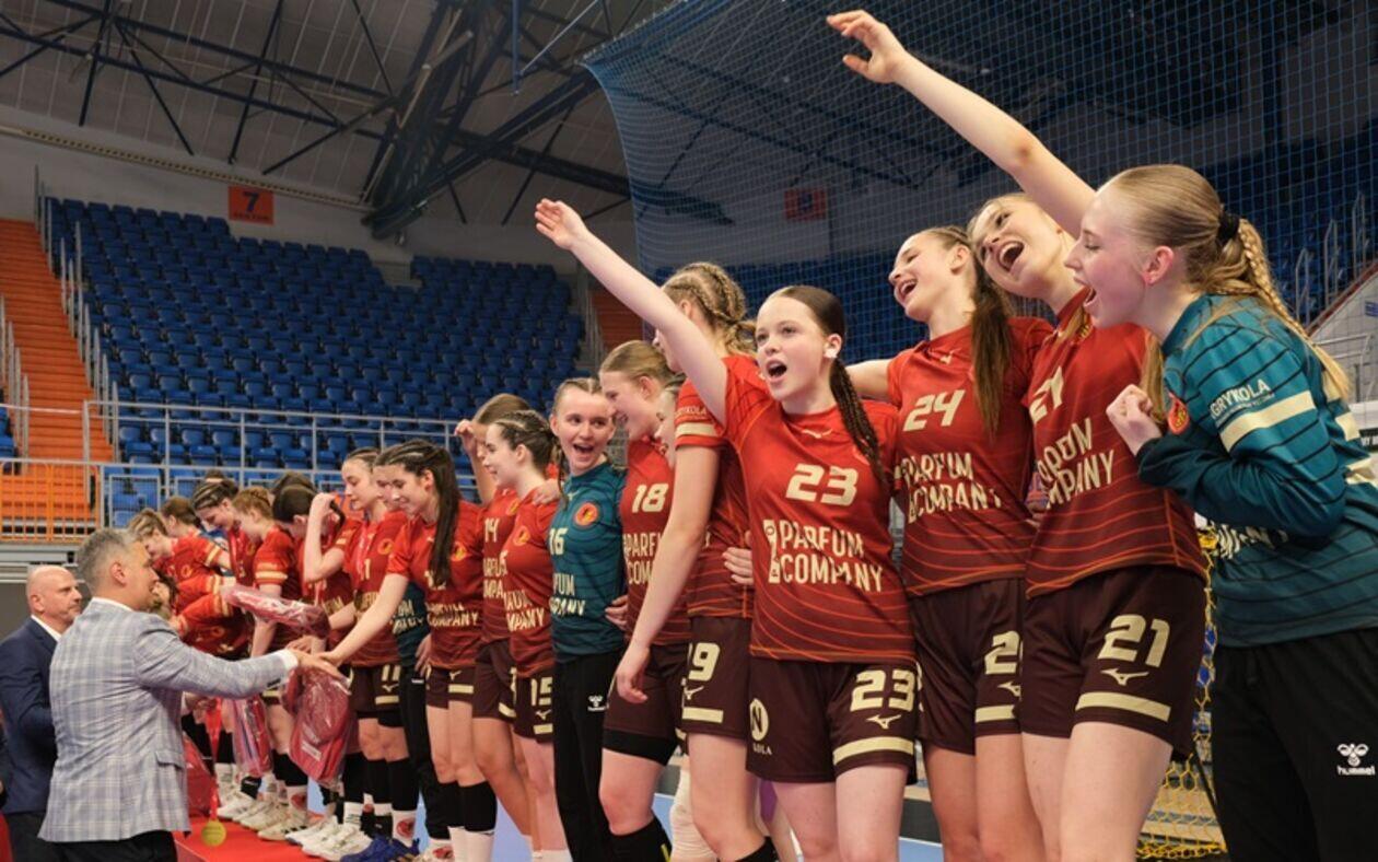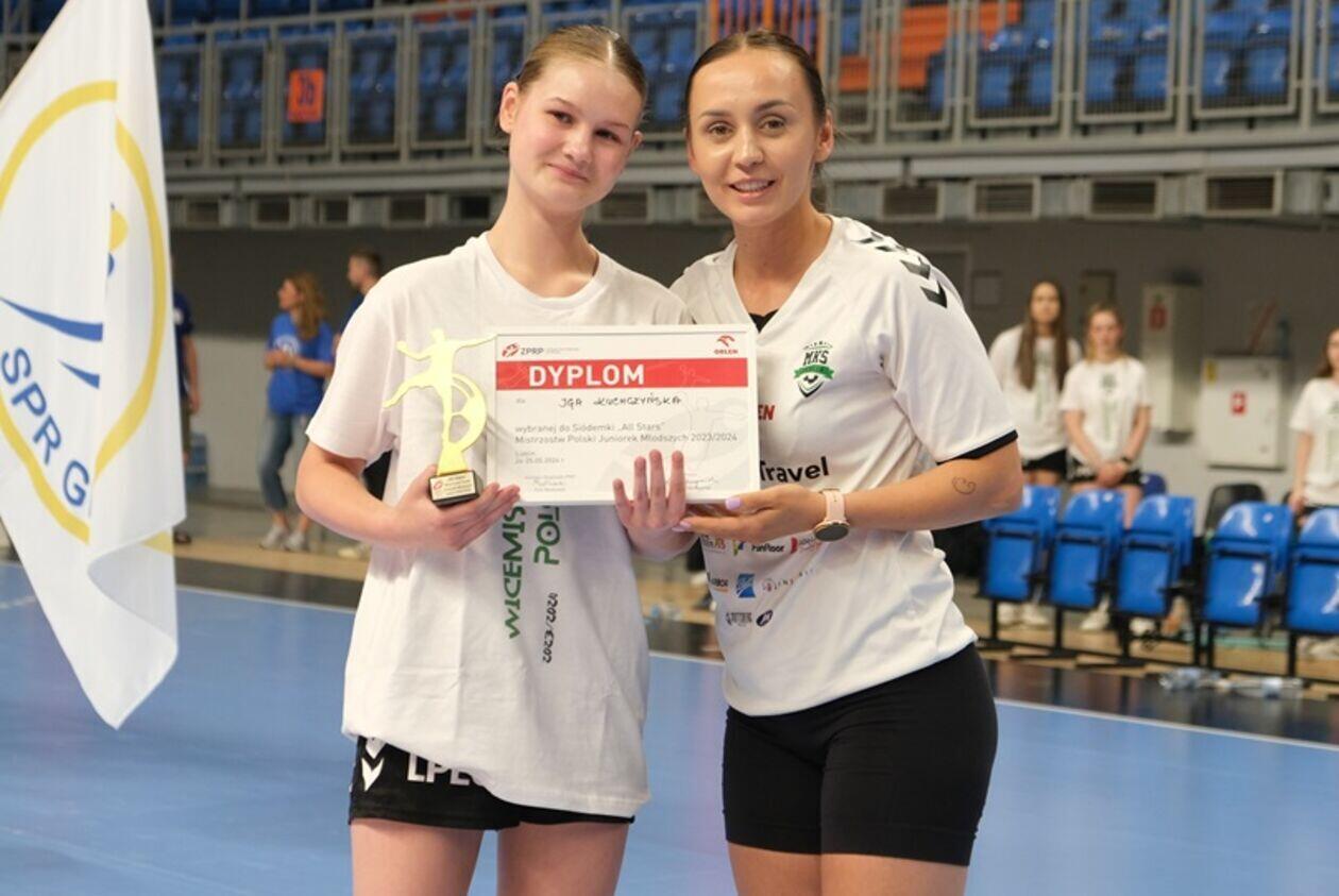 Dekoracja najlepszych zespołów i zawodniczek Mistrzostw Polski Juniorek Młodszych w piłce ręcznej