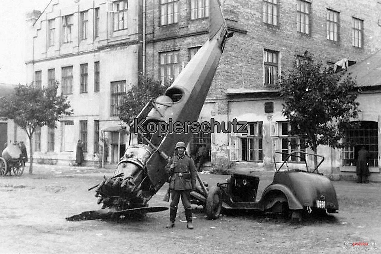 Zniszczony samolot na ulicy Wrońskiej, w tle zabudowa Lubelskiej Wytwórni Samolotów.