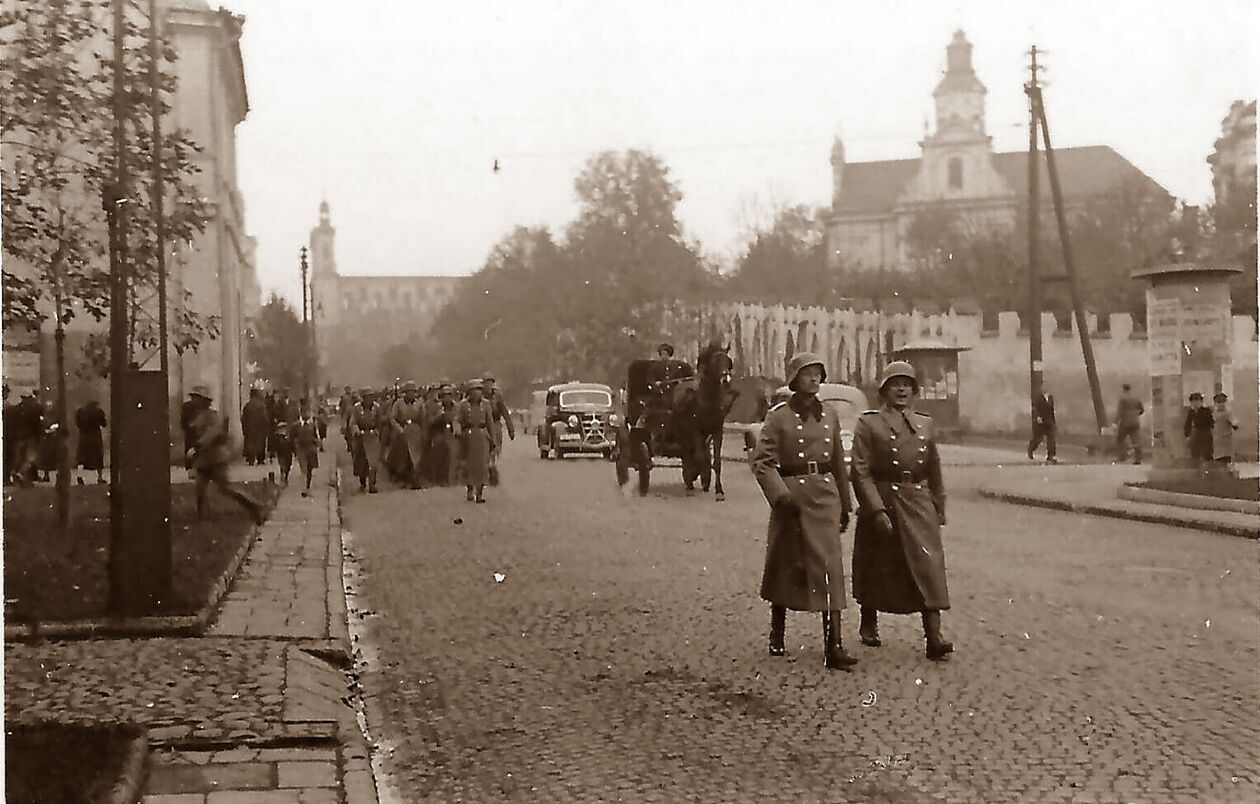Wojska niemieckie przy ulicy Wyszyńskiego w Lublinie; widok w stronę zburzonej Katedry.