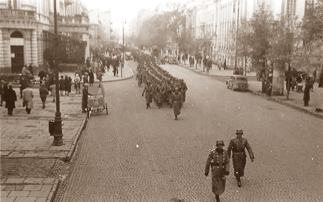 Wojska niemieckie maszerują Krakowskim Przedmieściem.