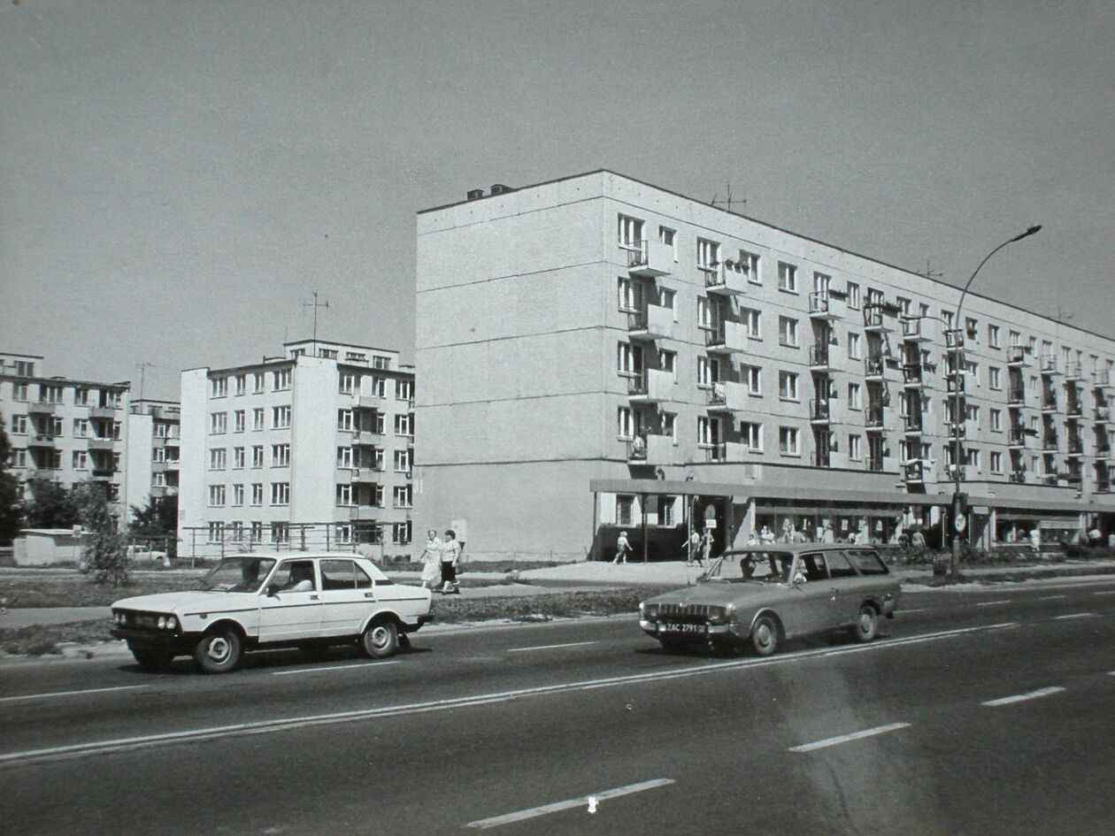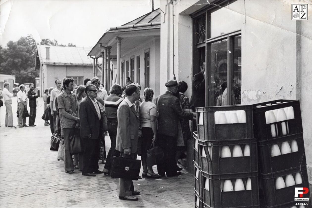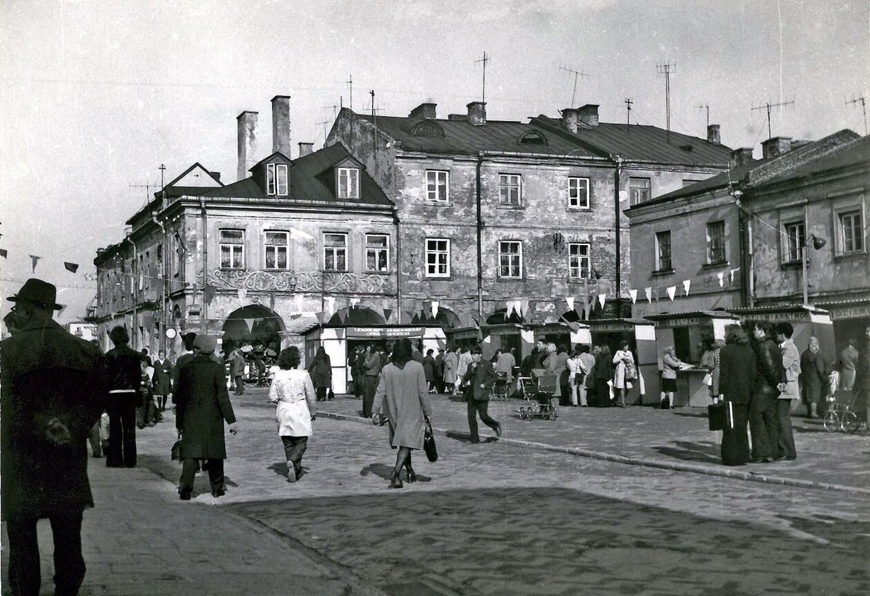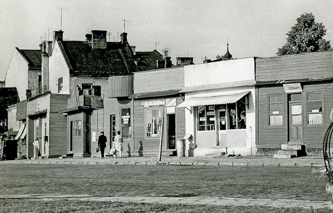 Plac Stefanidesa. Kolejka do sklepu spożywczego PSS Społem w kamienicy pod numerem 6. Następny budynek z podcieniami to tzw. jatki a za nimi dawna kuźnia kozacka.