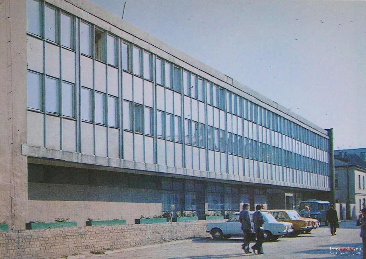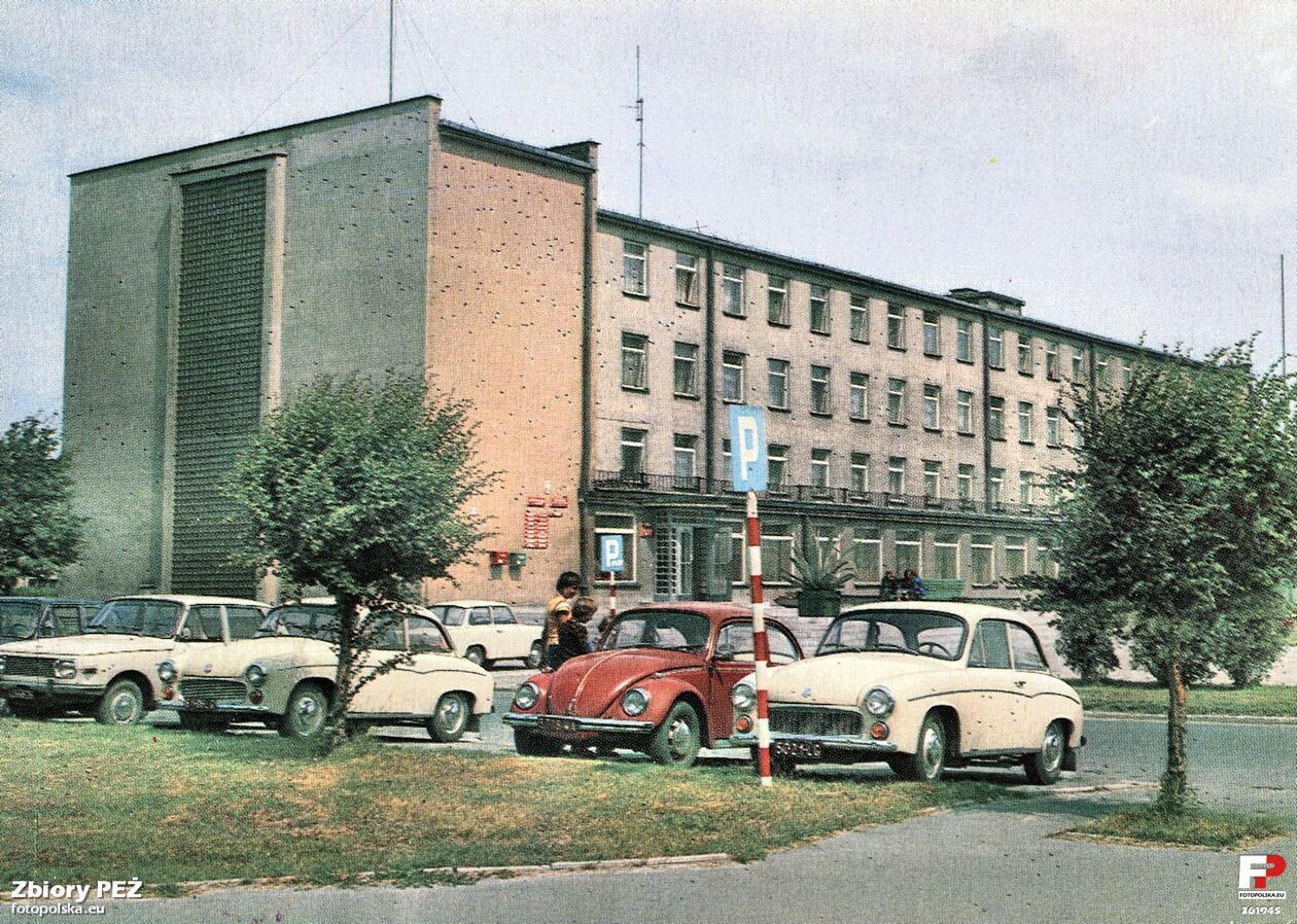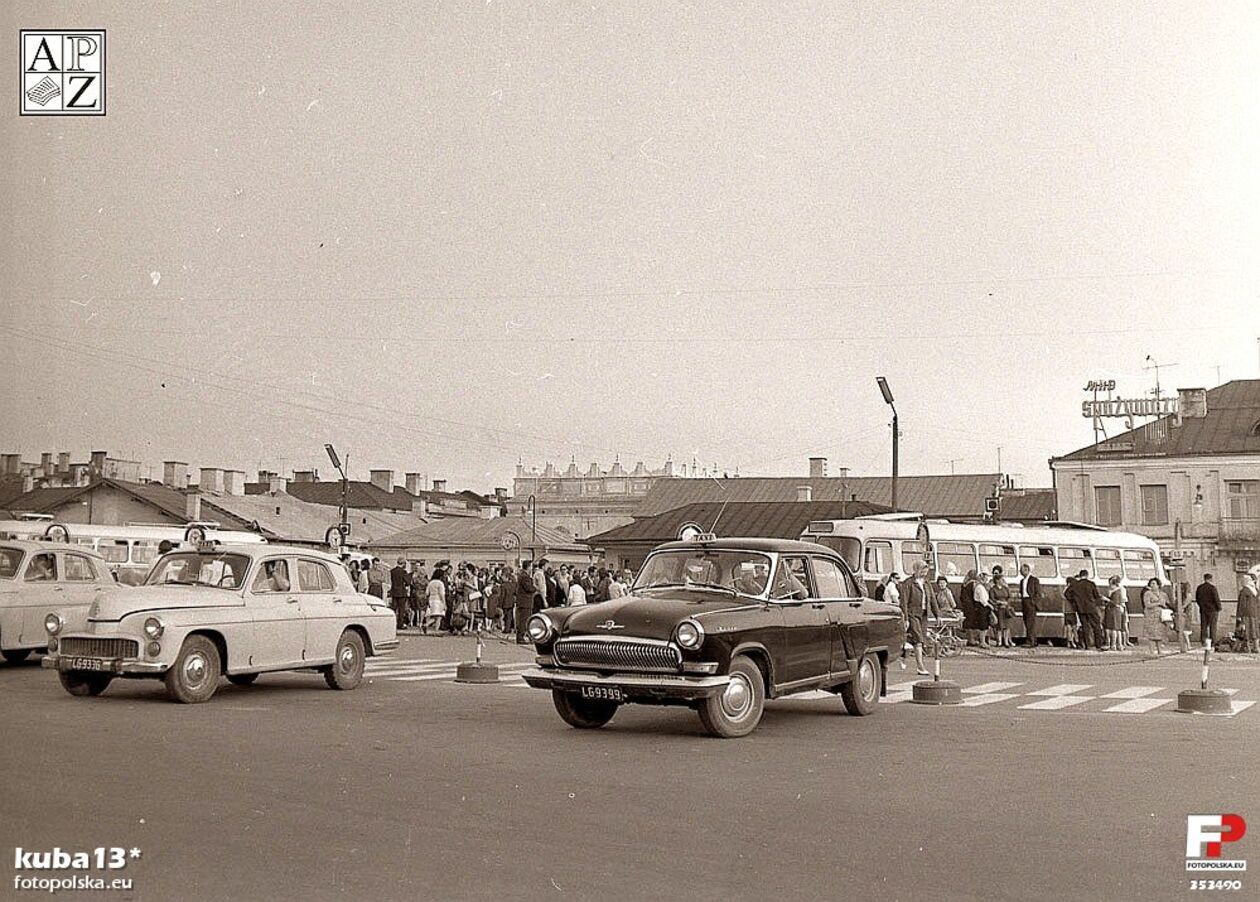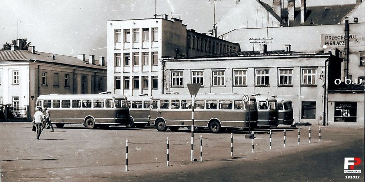 Lata 1970-1975 r. Dawny dworzec autobusowy na placu Wolności. Za autobusami dawny biurowiec ZKD obecnie Powiatowy Urząd Pracy.