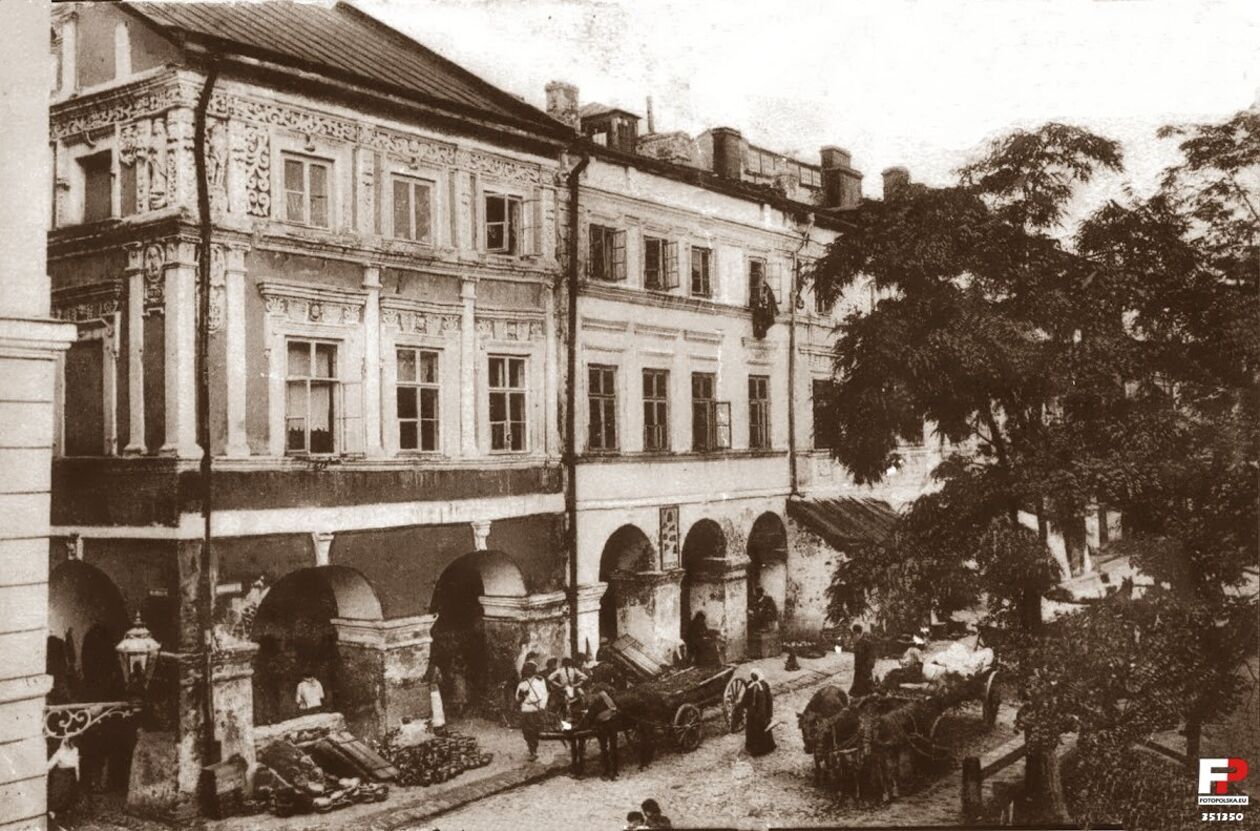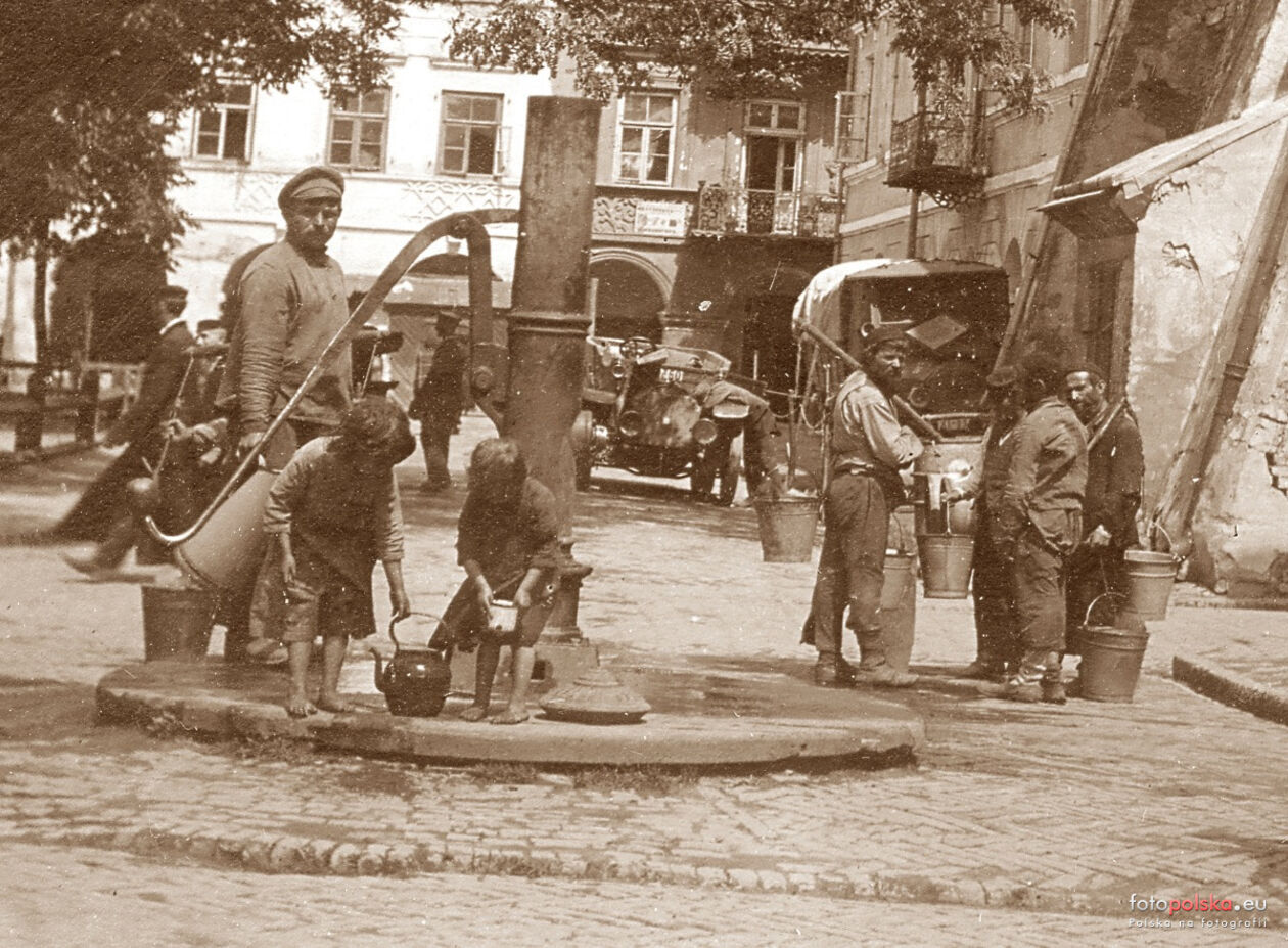 Rynek Wielki. W głębi kamienice ormiańskie. Na pierwszym planie pompa przy Kamienicy pod św. Kazimierzem. Sierpień 1915 r.