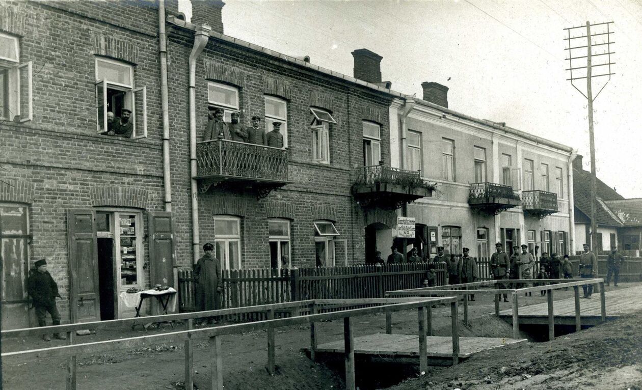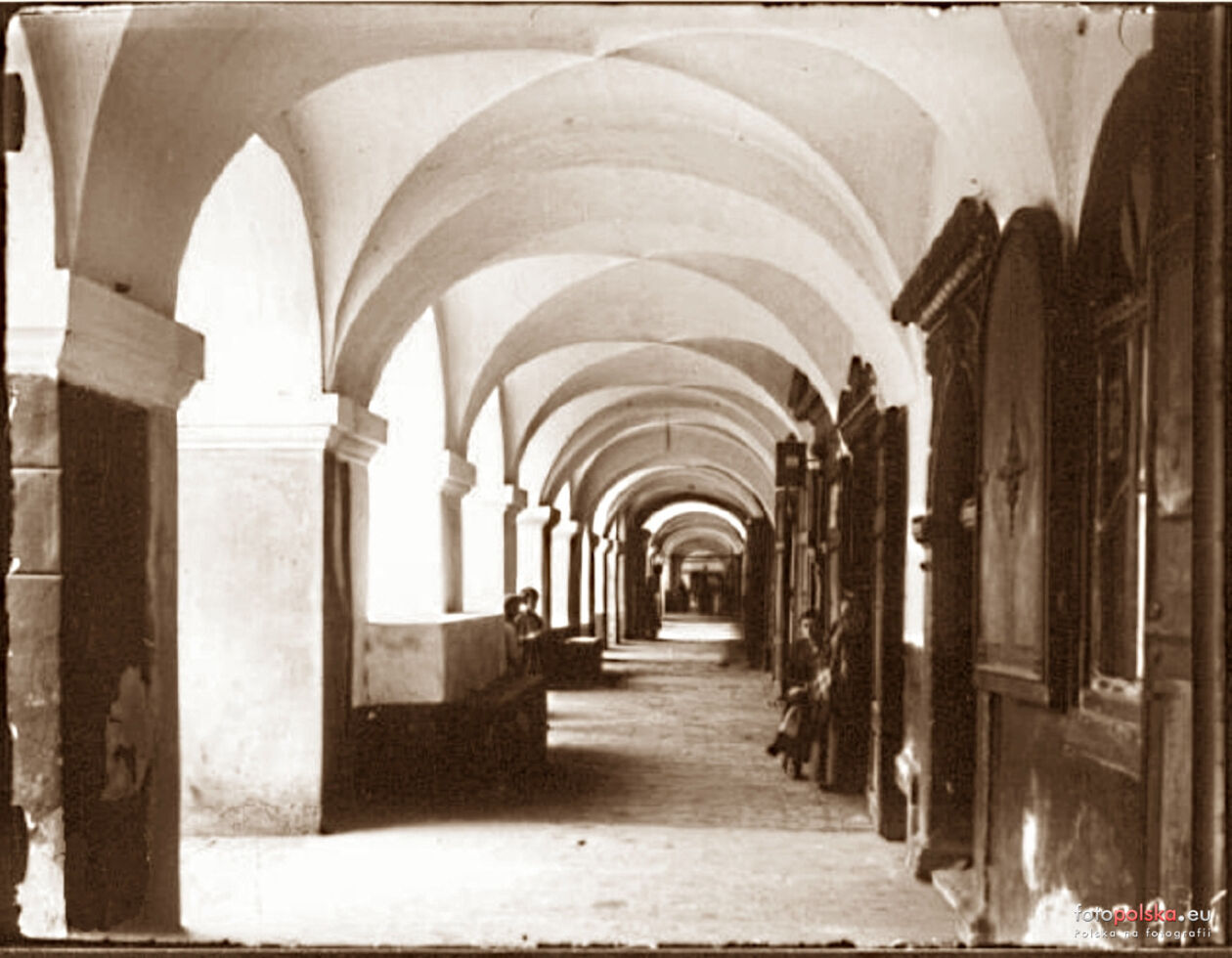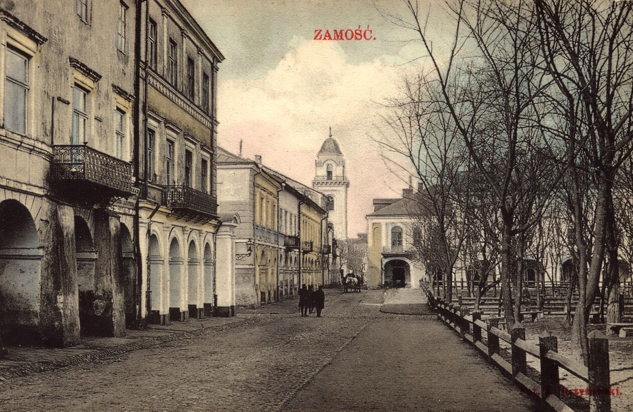 1910 r. Rynek Wielki - widok wzdłuż podcieni ulicy Staszica w kierunku dzwonnicy zamojskiej katedry.