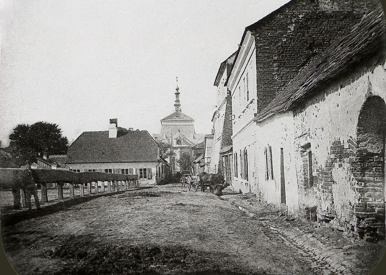 Lata 1890-1910. Obecna ulica Kościuszki. Po prawej na pierwszym planie kamienica w której urodziła się Róża Luksemburg. Następna to tzw. Generałówka. I dalej kościół zespołu klasztornego Klarysek.
