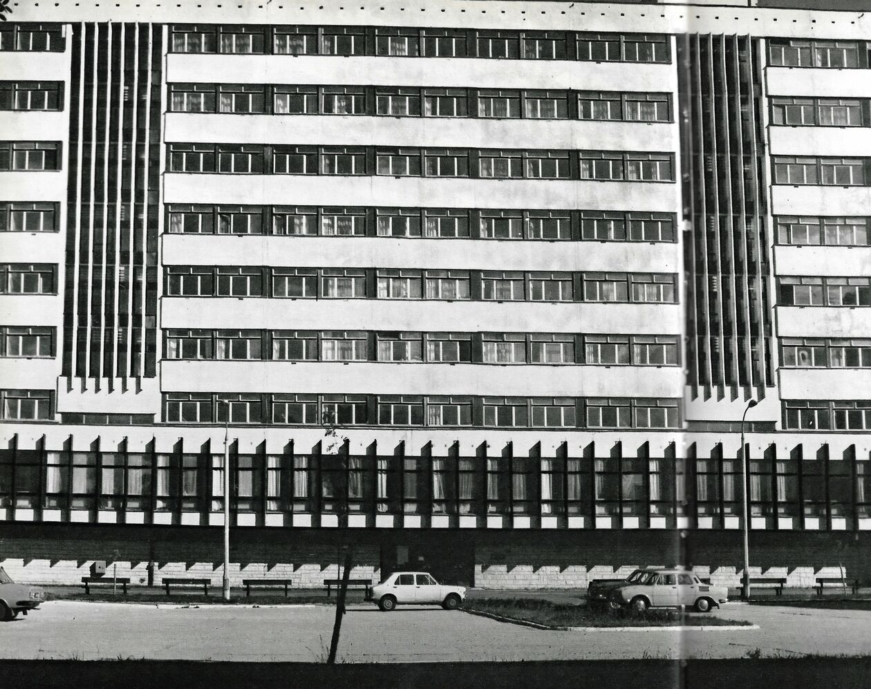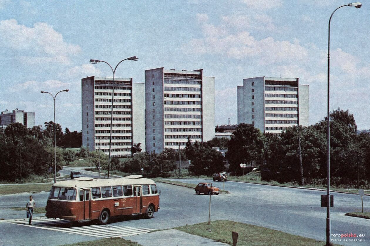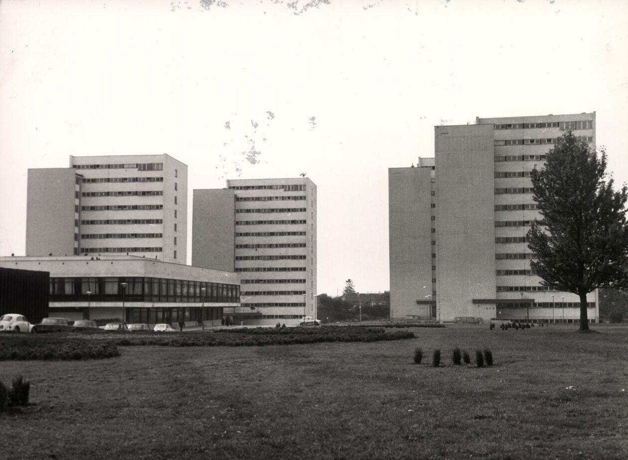 Akademiki PL. Od lewej_nr. 4, nr. 3, nr.2 i nr.1. Na pierwszym planie stołówka.