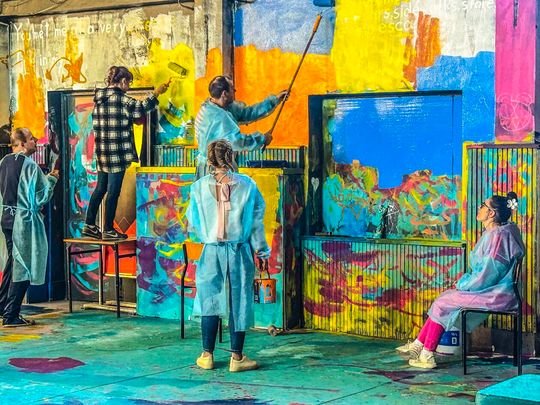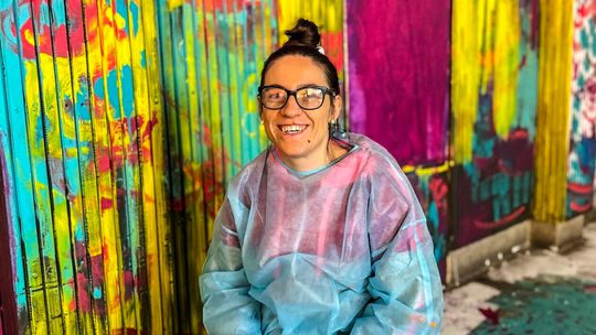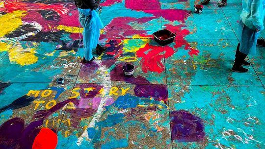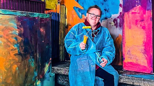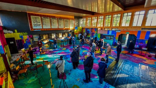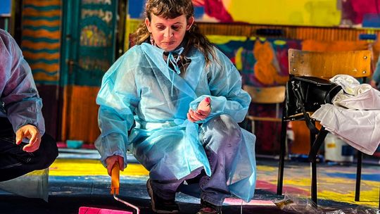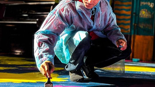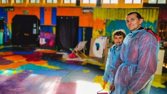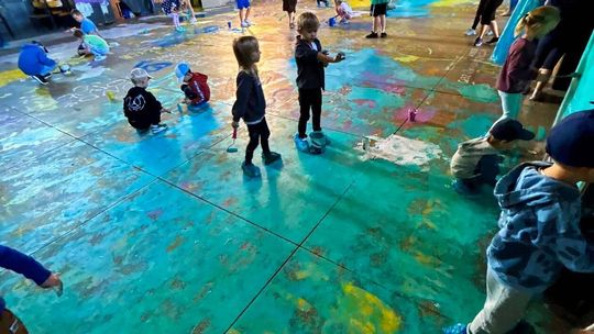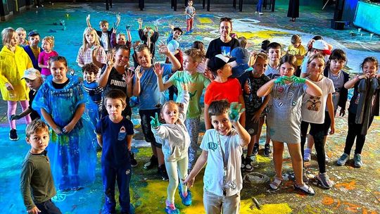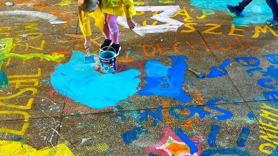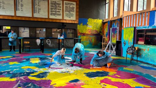 Dzieci i dorośli malowali wnętrza dworcowej poczekalni