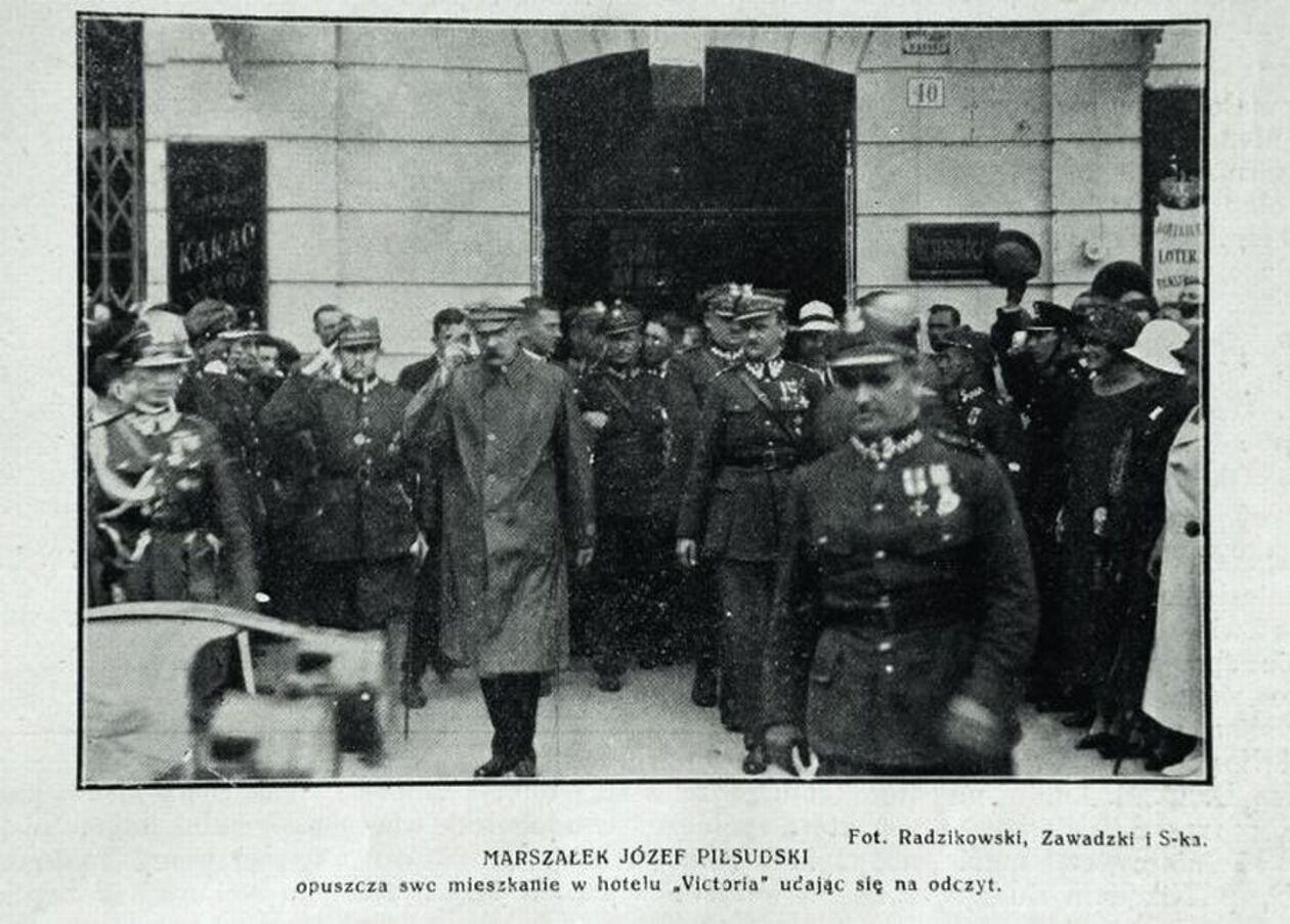 Marszałek Piłsudski opuszcza hotel Victoria.