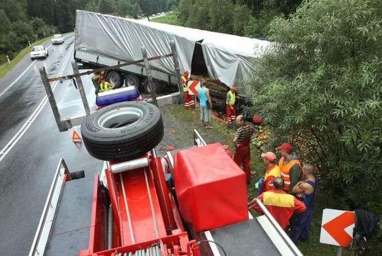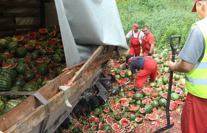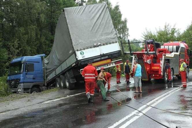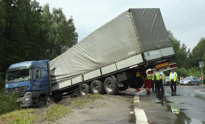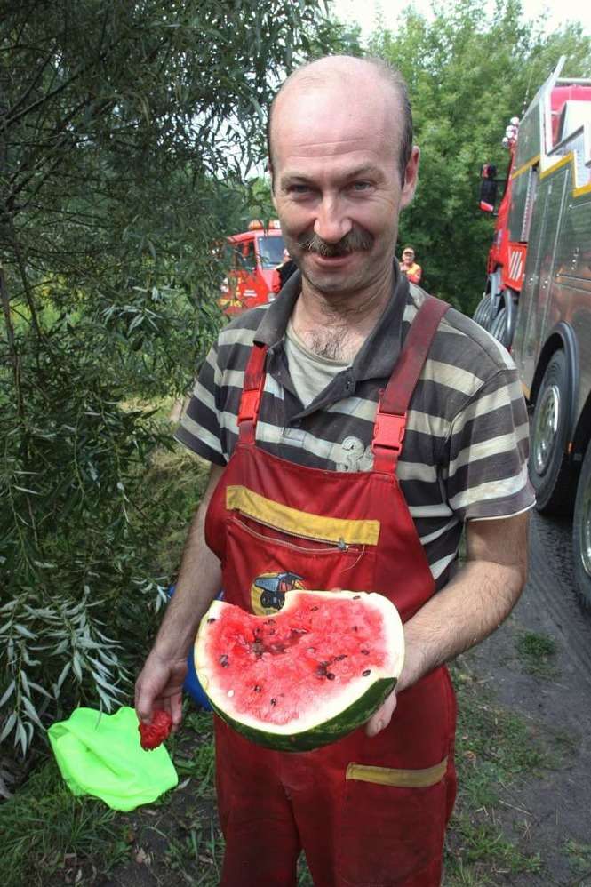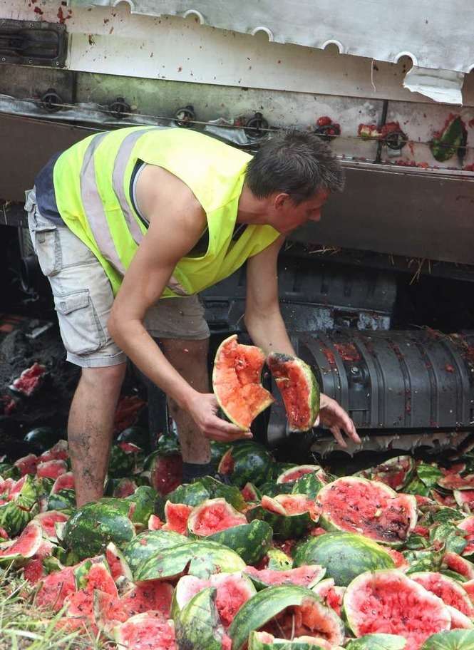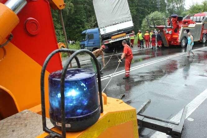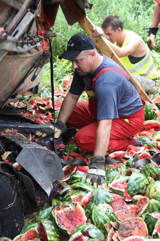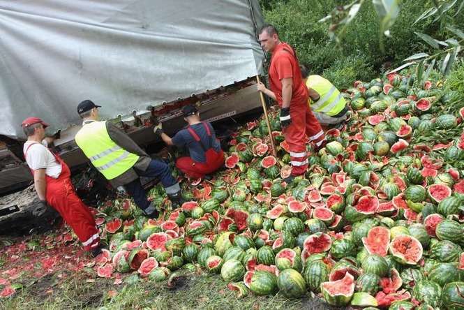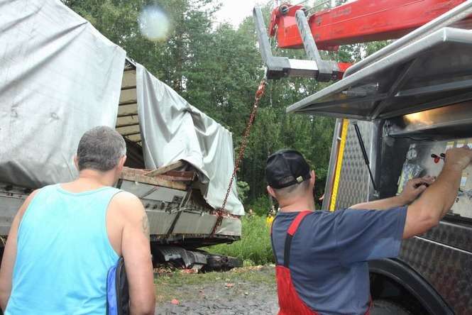 Litewski Tir załadowany 23 tonami arbuzów wjechał do rowu w miejscowości Wandzin pod Lubartowem. Wypadek zdarzył się ok. godz. 12 na krajowej drodze 19. Zdjęcia: Maciej Kaczanowski.