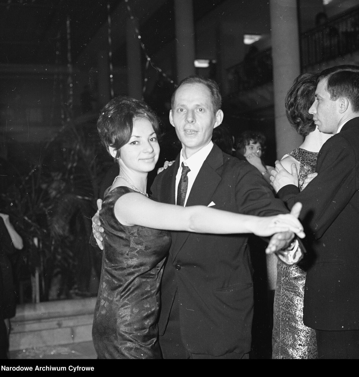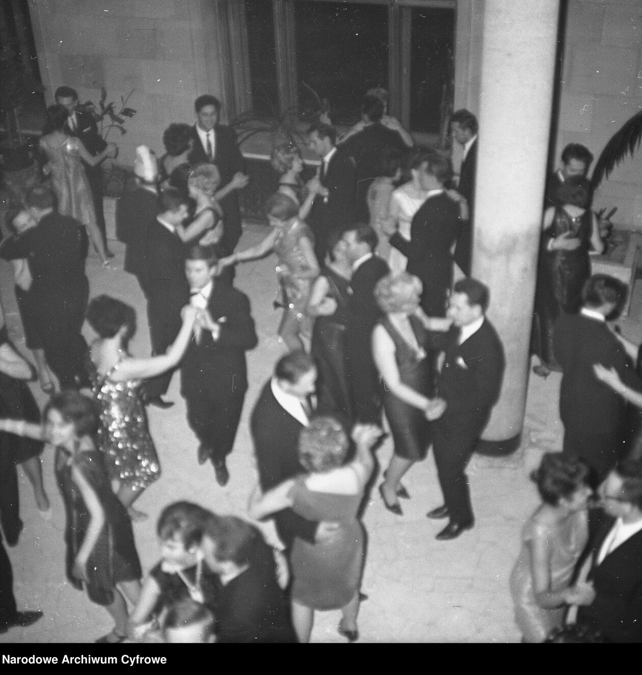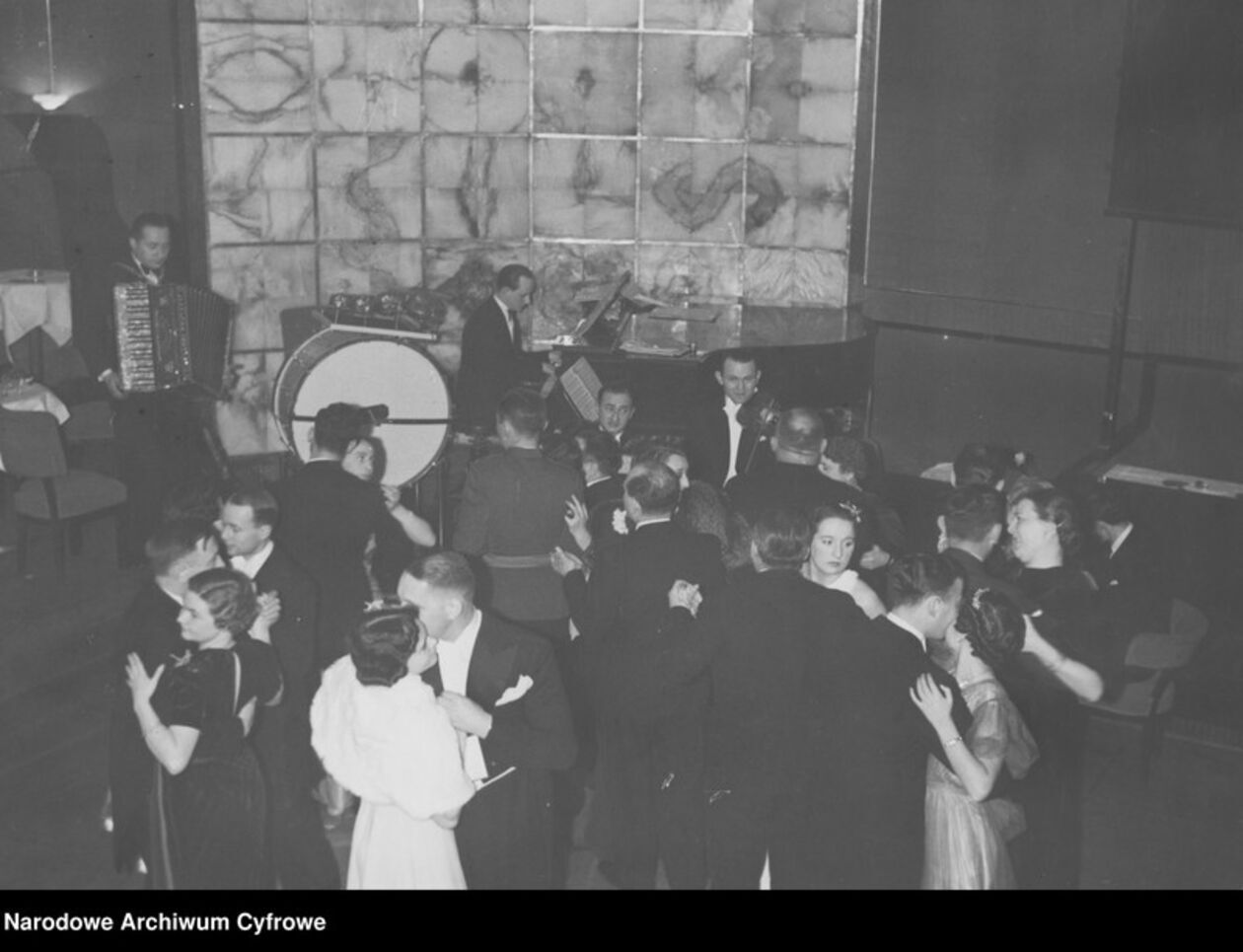 Uczestnicy balu podczas tańca. Na drugim planie widoczni członkowie zespołu muzycznego.
