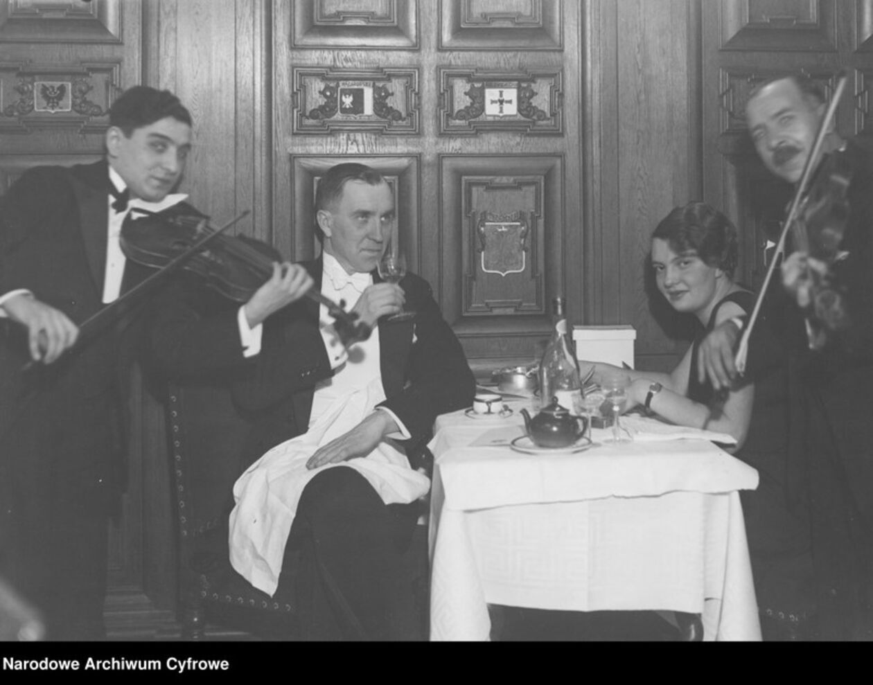 Para uczestników balu przy stoliku. Widoczni muzycy grający na skrzypcach.