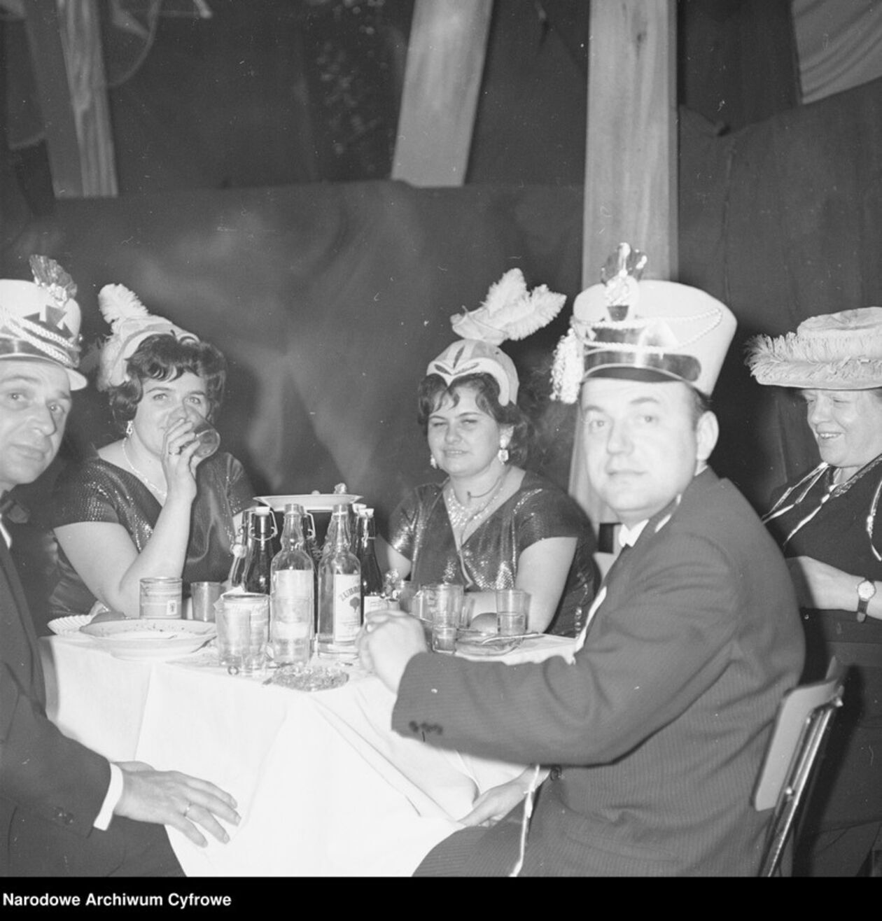 Goście w przebraniach siedzą przy stoliku lata 60-te.