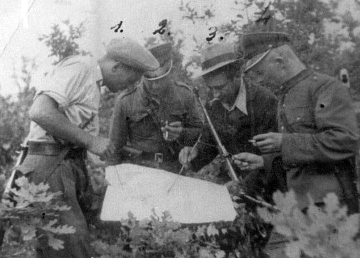 Grupa żołnierzy 1. szwadronu V Wileńskiej Brygady AK podczas marszu, fot. AIPN, sygn. IPNBU-3-3-6-18.