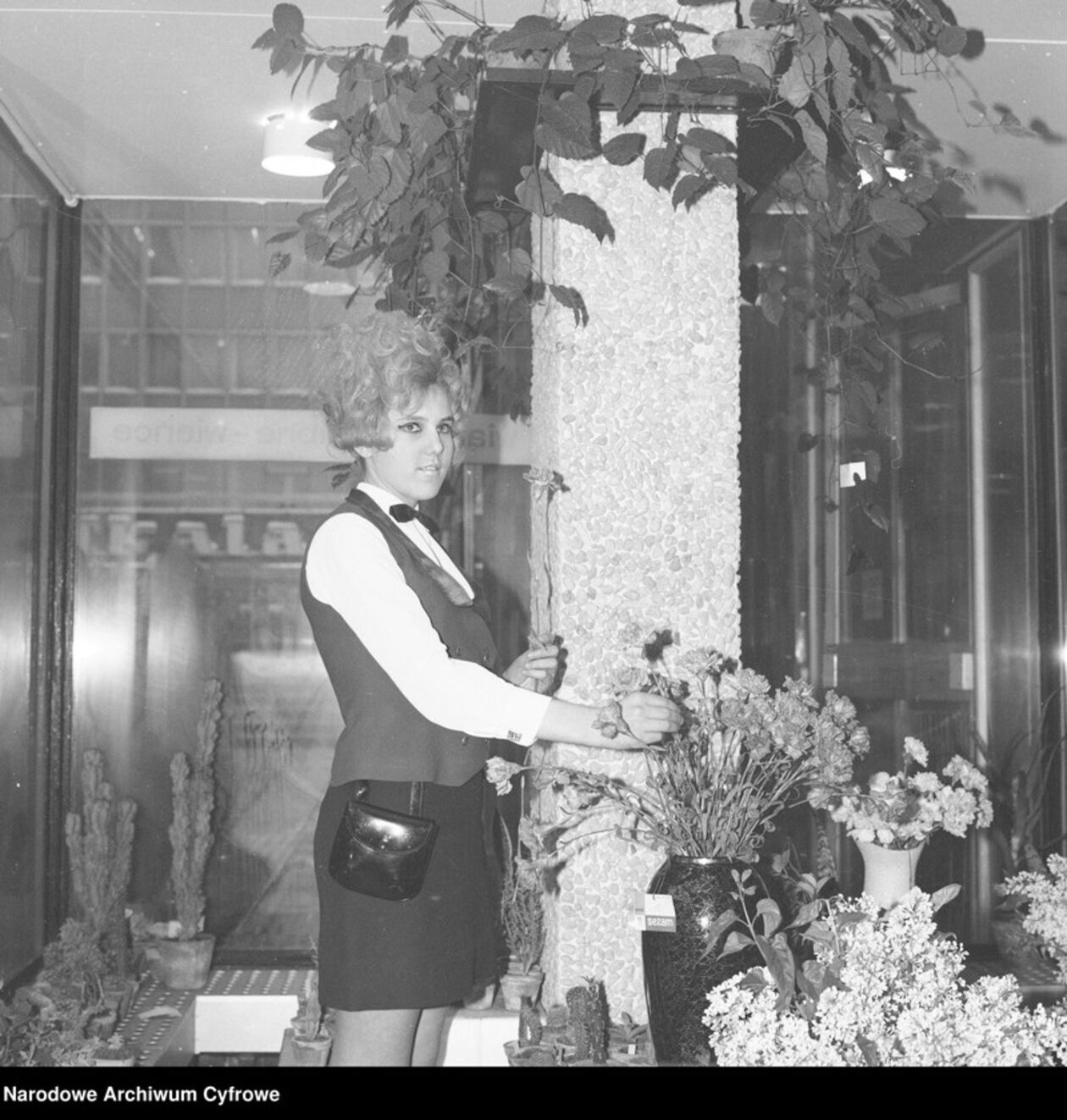 Kwiaciarka przy wazonie z goździkami.