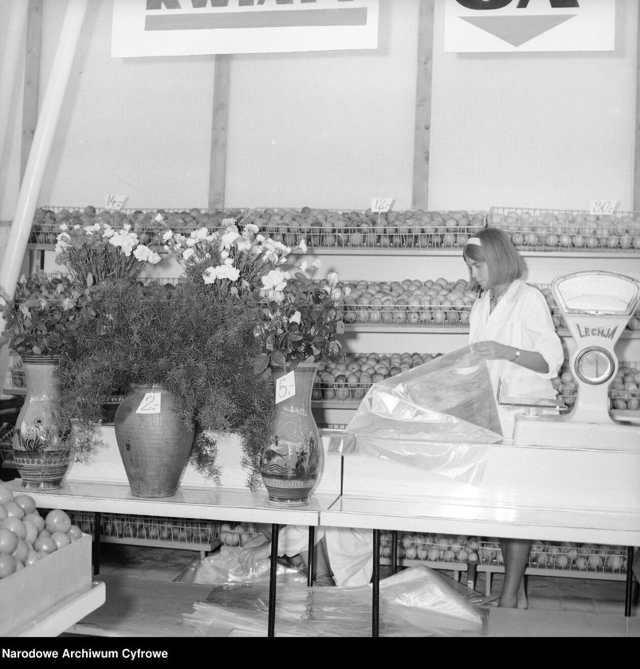 Ekspedientka podczas pracy na stoisku z owocami i kwiatami.