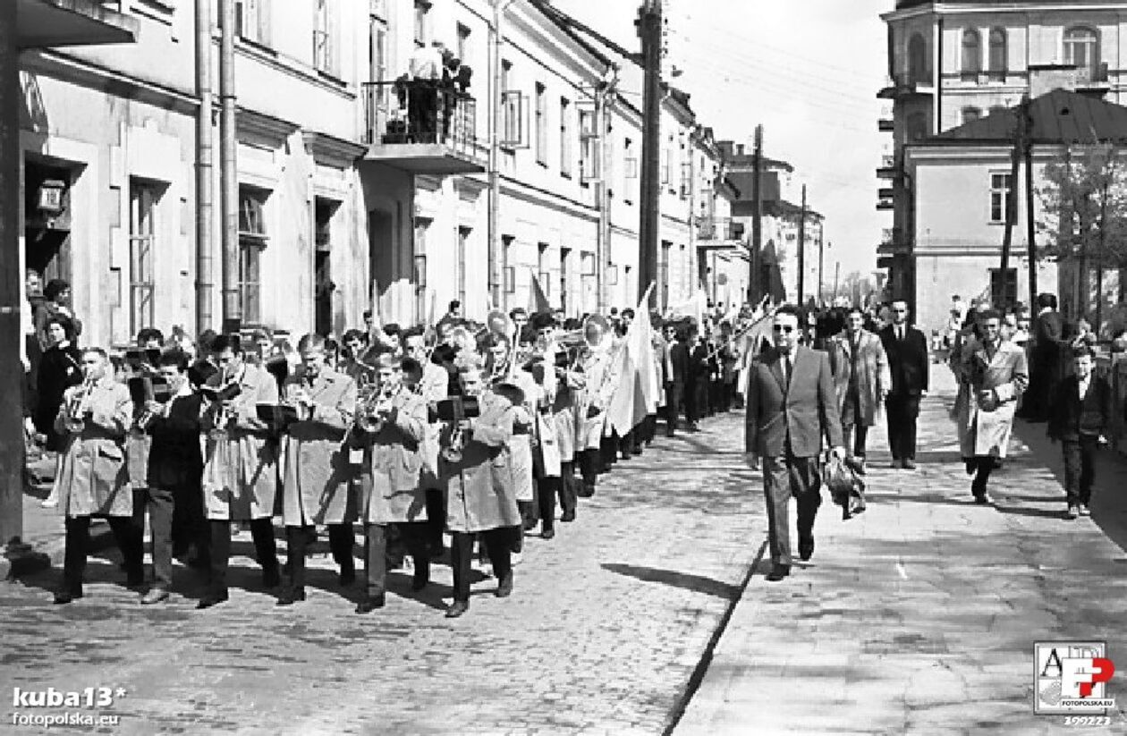 Ulica Żeromskiego przy Rynku Wodnym - orkiestra Technikum Mechaniczno-Elektrycznego w Zamościu w pochodzie 1 Majowym. w roku 1963.