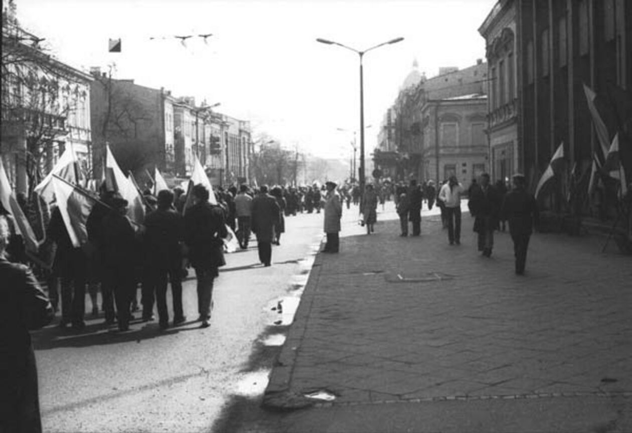 Krakowskie Przedmieście podczas pochodu w dniu 1 maja 1982 roku. Fot. Piotr Choma.