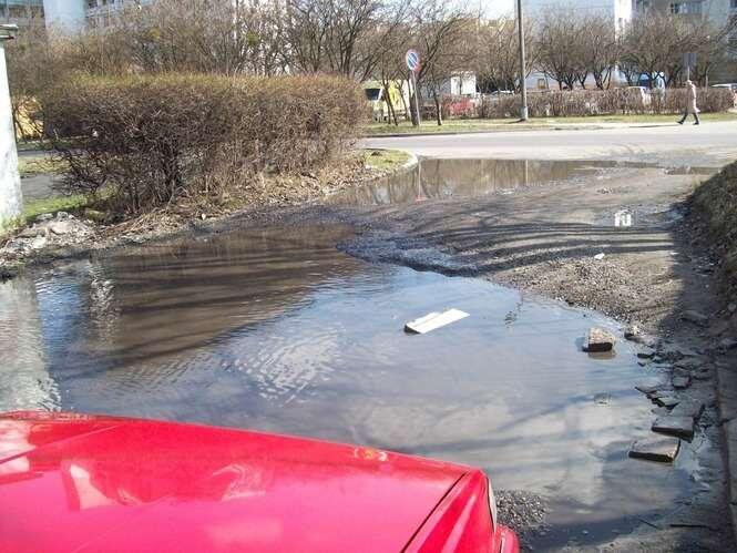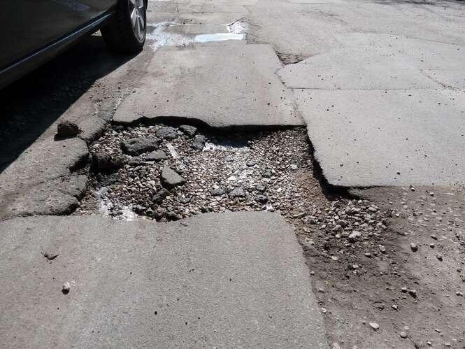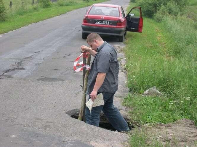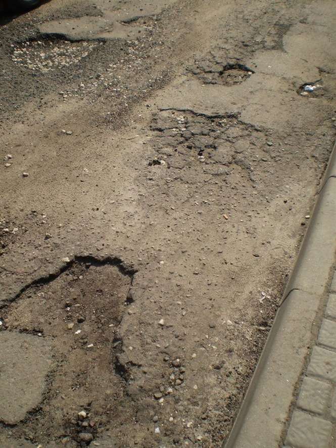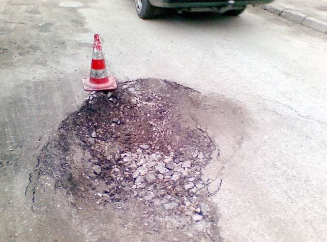 Dziura czy tez raczej wyrwa jest juz od paru tygodni i pewnie kolejne pare miesiecy przed nią. Wjechanie w dziure równa sie zawieszeniem sie samochodu nad nią.