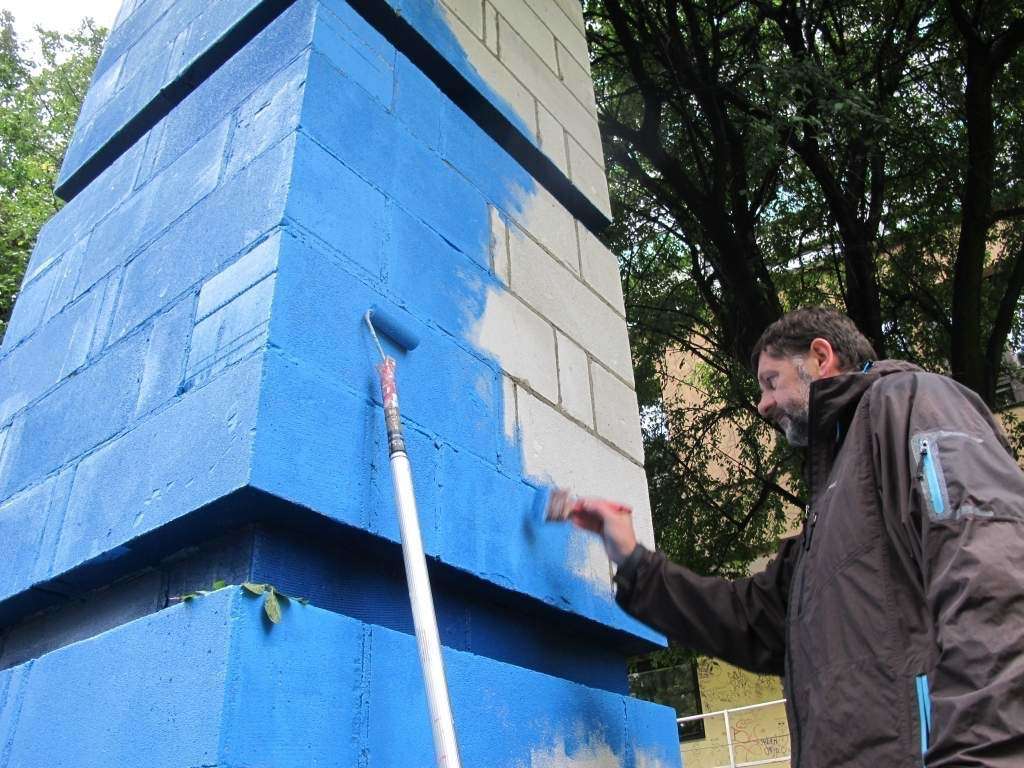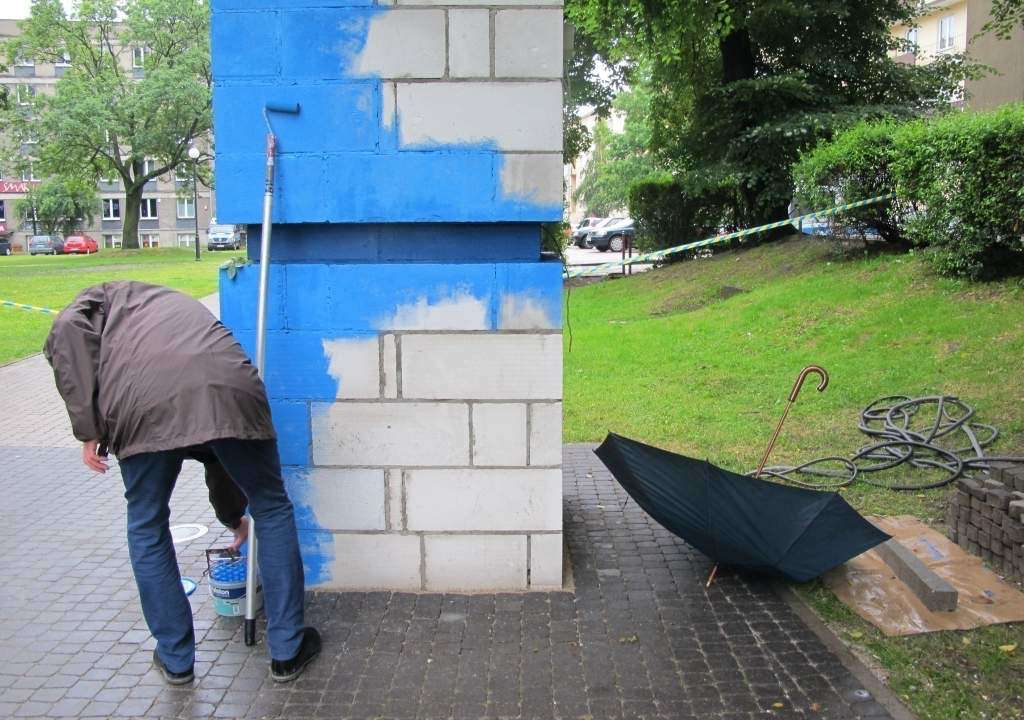 „Błękitny obelisk” Jana Gryki. Z dnia na dzień się zmienia. Nawet w czasie wernisażu artysta pracował.