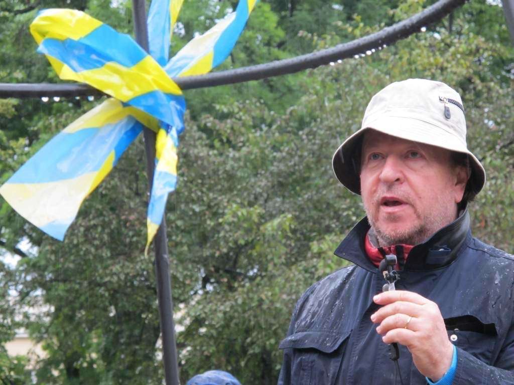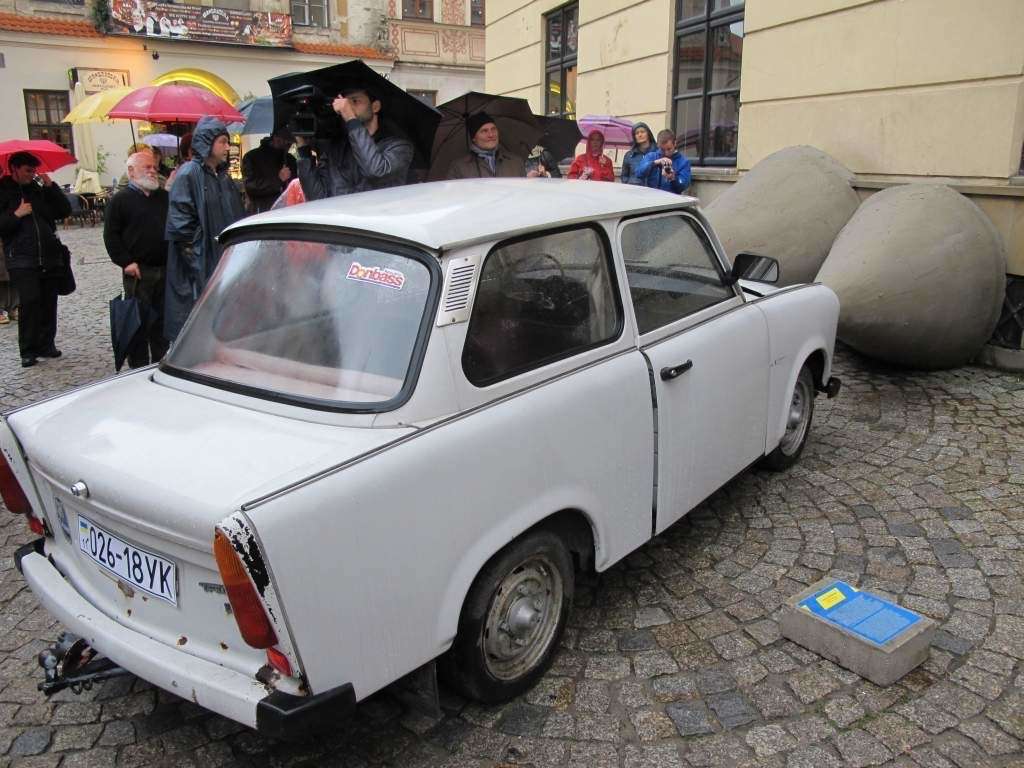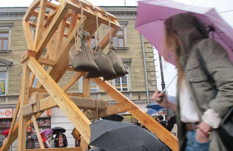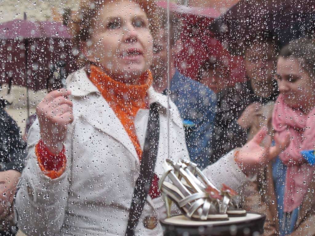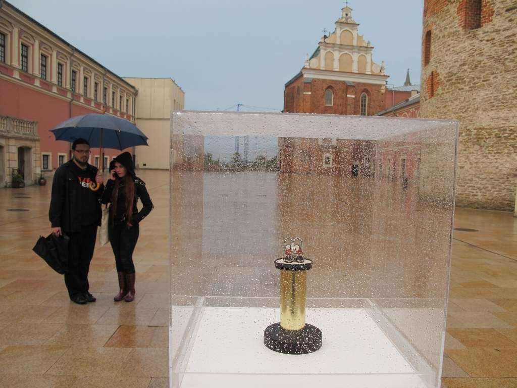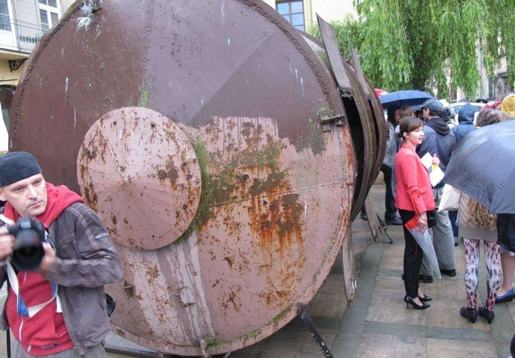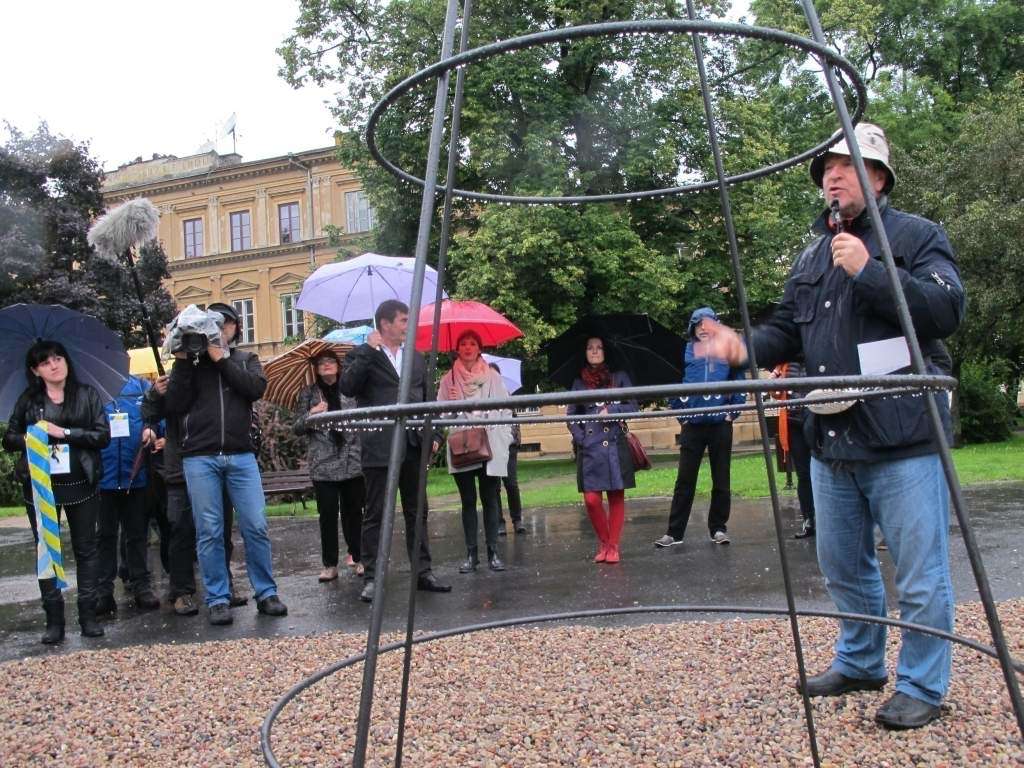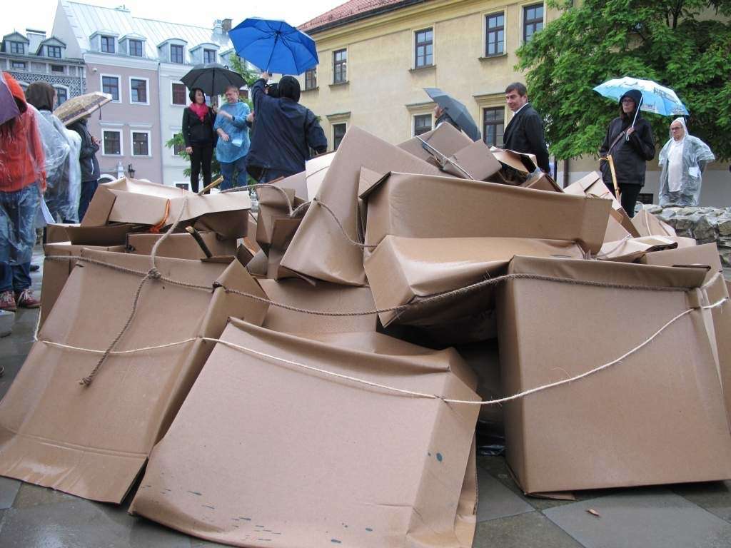 Deszcz działał na korzyść „Podarków z nieba” które zrzucił na plac Po Farze Andrij Sahajdakowski. Strugi wody wymywały z pudeł błękitną farbę. Pracę ogląda (bez parasola) Mirosław Haponiuk, dyrektor Ośrodka Międzykulturowych Inicjatyw Twórczych „Rozdroża”, który organizuje Open City