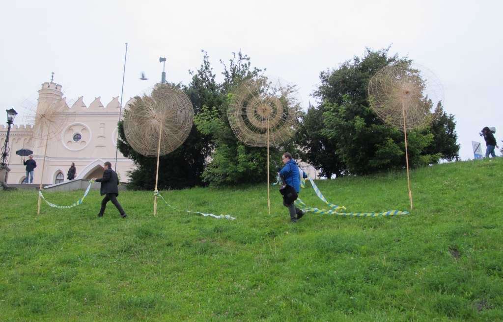 Tak wyglądało otwarcie „Wiatraków” Mirosława Maszlanko. Niestety praca wykorzystuje energię słoneczną i deszcz ją unieruchamia. Ale i tak ulotne, kuliste formy z trawy i wosku, które pojawiły się na zamkowym wzgórzu wygrywają w naszym prywatnym rankingu tegorocznej edycji Open City.