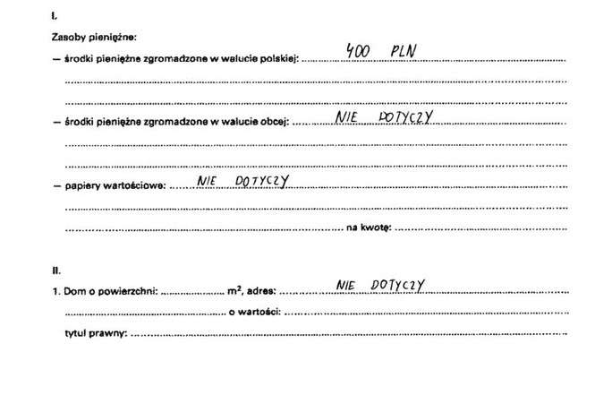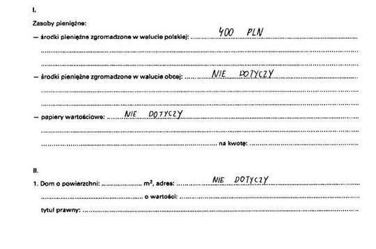 Oszczędności 2 tys. zł, 400 euro, mieszkanie 43 mkw. warte 150 tys. zł, dochody 32 tys. zł, opel astra 1999 warty 10 tys. zł.