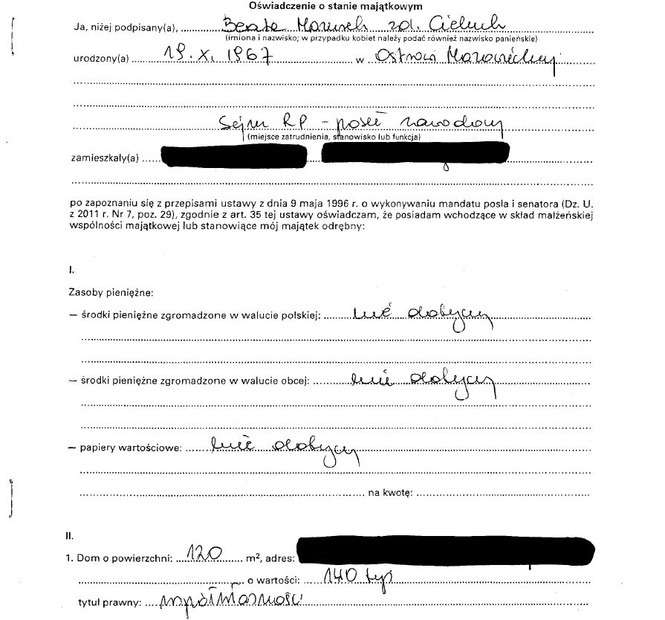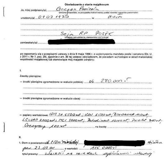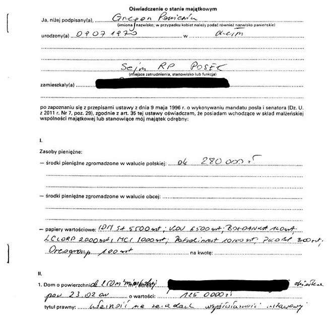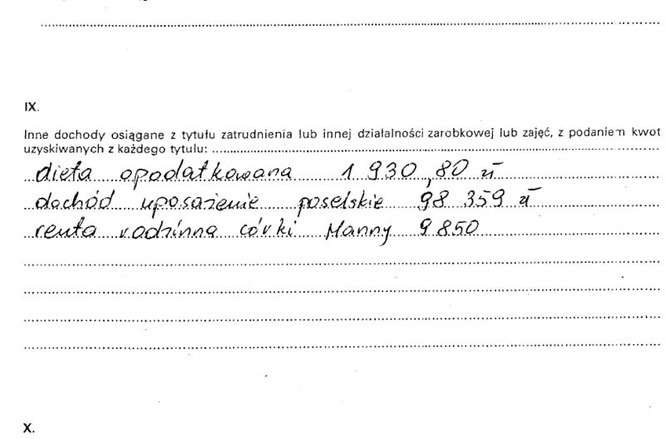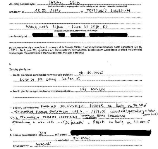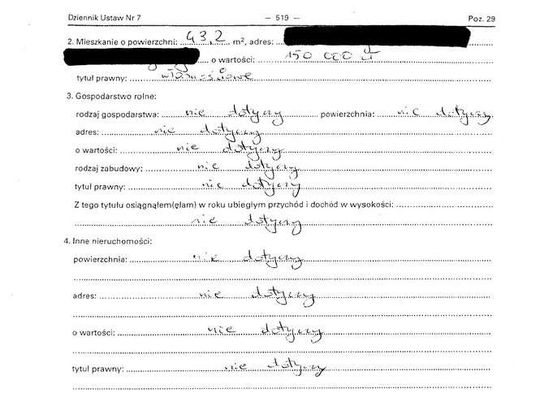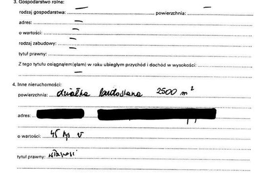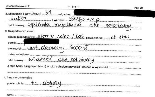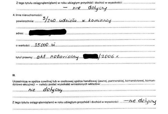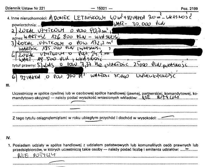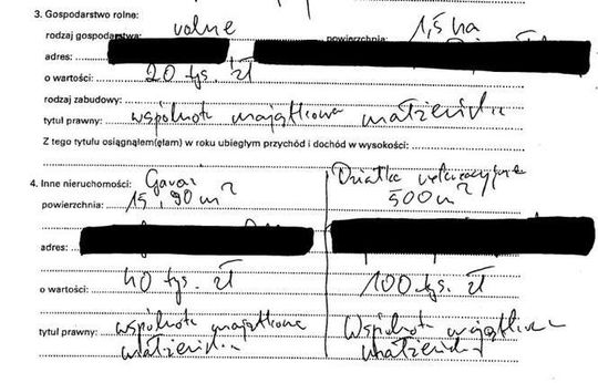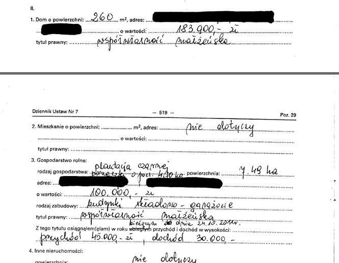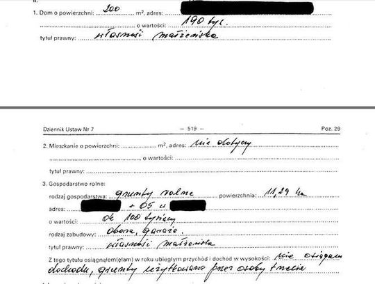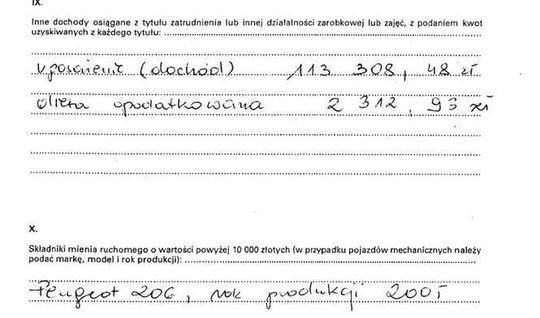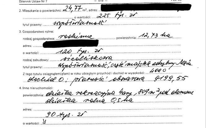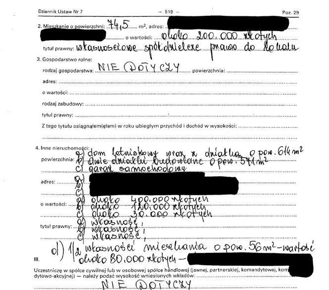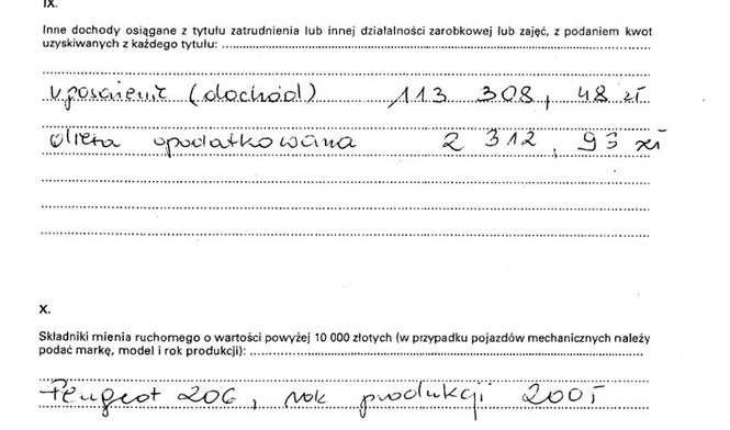 Oszczędności 10 tys. zł, lokaty 31 tys. zł, papiery wartościowe 129 tys. zł, dom 200 mkw. warty 350 tys. zł, działki wart 5 tys. zł i 4 tys. zł, dochody 108 tys. zł, mazda 6 z 2009 r., kredyt hipoteczny 14 tys. franków.