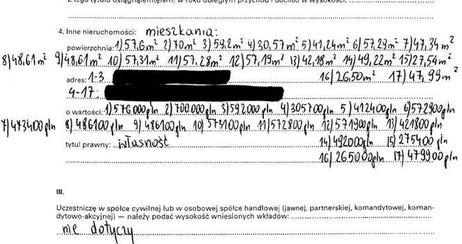 Oszczędności 860 tys. zł, 560 tys. euro, rachunek inwestycyjny 146 820 zł, dom 196 mkw. warty 2,5 mln zł, mieszkanie 116 mkw. warte 1,1 mln zł, oraz 16 innych mieszkań od 26,50 mkw. do 70 mkw. warte w sumie 8,2 mln zł. Dochody 343 tys. zł, audi Q7 warte 250 tys. zł