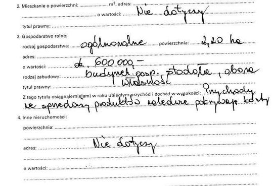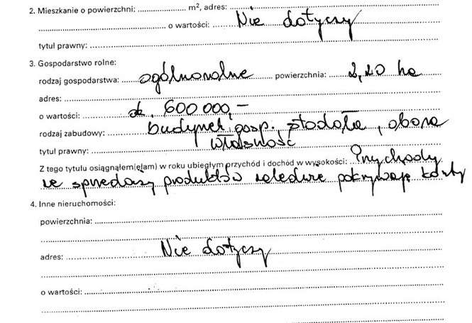Oszczędności 800 dolarów, 4 udziały w Funduszu Św. Jerzego warte 200 zł, dom 200 mkw. warty 600 tys. zł, mieszkanie 24 mkw. warte 225 tys. zł, gospodarstwo 12 ha warte 120 tys. zł, działka rekreacyjna warta 90 tys. zł, dochody 181 tys. zł, volkswagen 2001 r., ciągnik ursus 2004 r., kredyt hipoteczny 120 tys. zł.