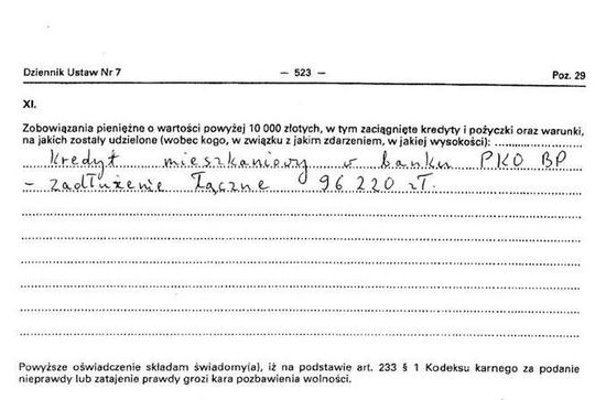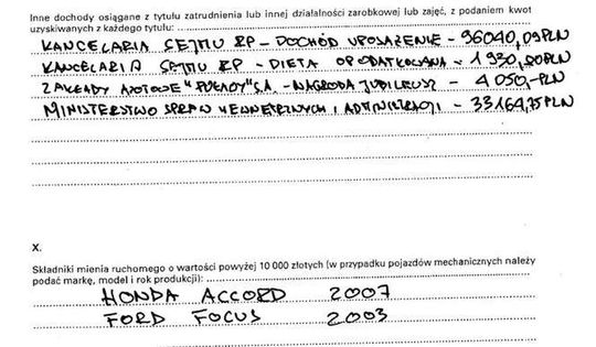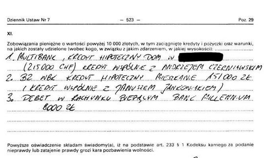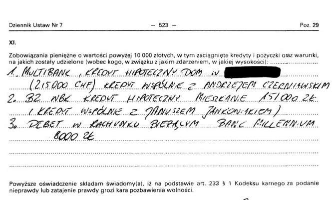 Oszczędności 8 tys. zł, dom 150 mkw. warty 250 tys. zł, gospodarstwo warte 70 tys. zł, dochody 99 tys. zł, peugeot 407 2007 r., kredyt 8 tys. zł, poręczenie kredytu 152 tys. zł, kredyt 39 tys. franków.